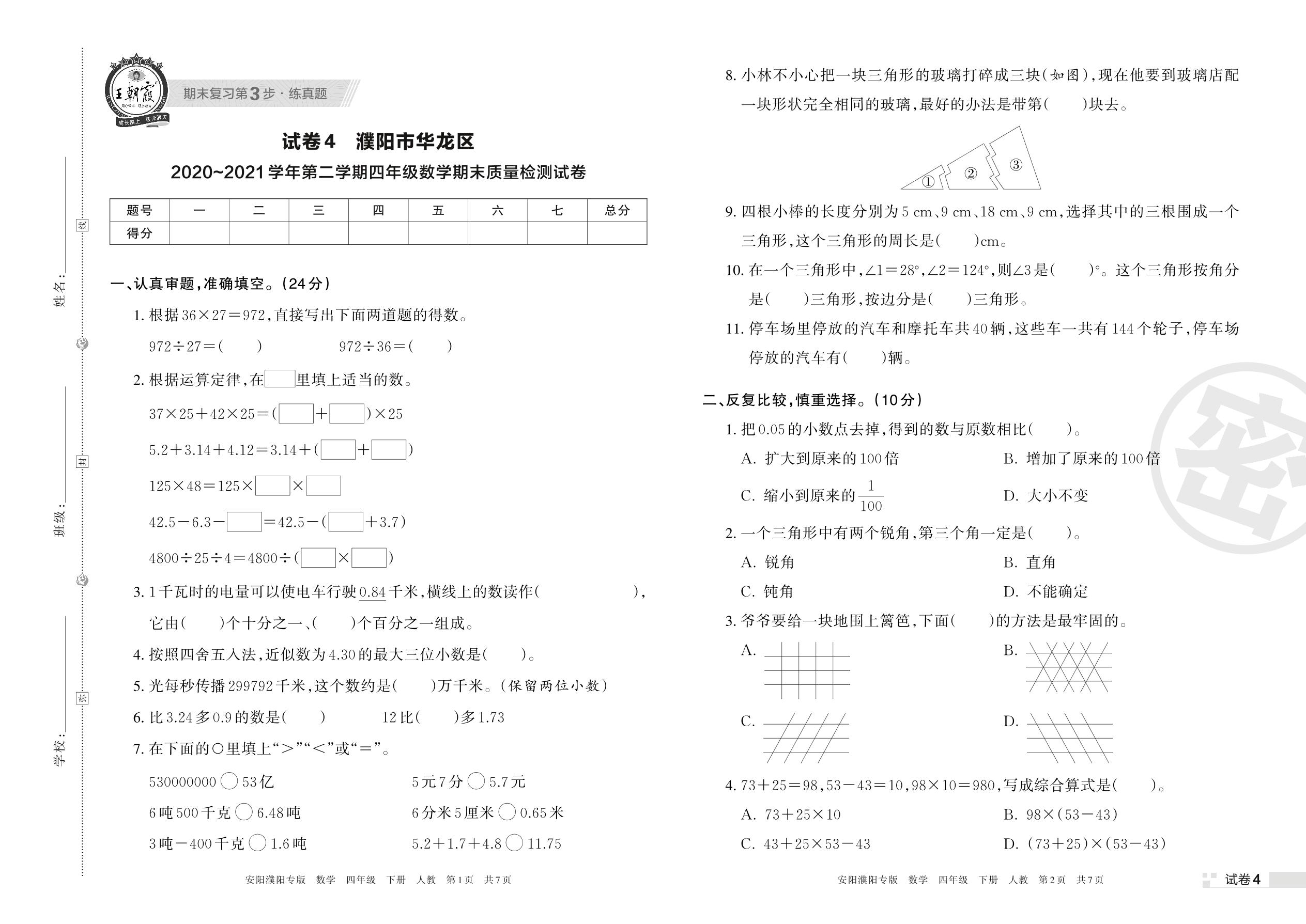 濮阳市华龙区2020~2021学年第二学期四年级数学期末质量检测试卷(人教版)【4】
