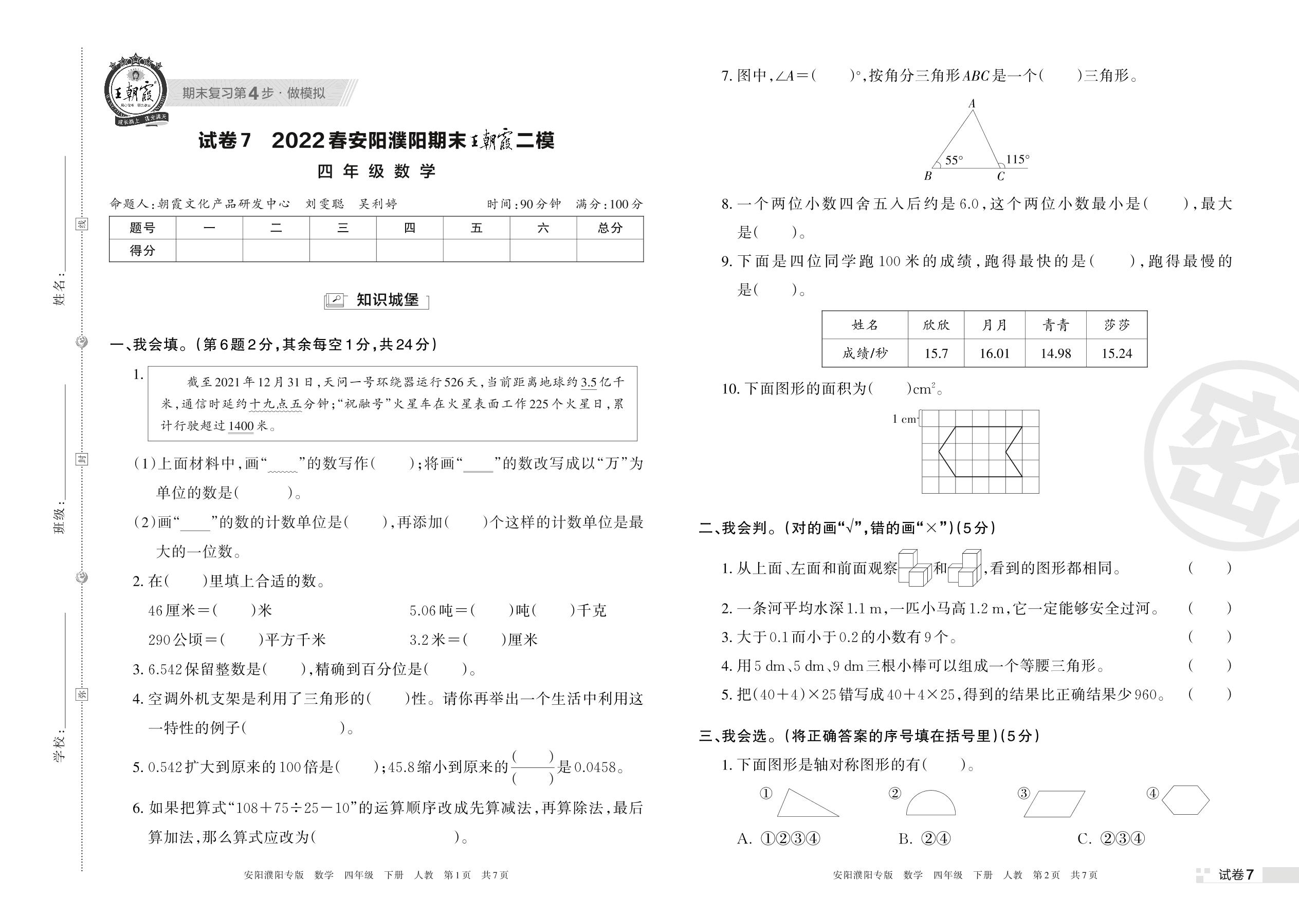 王朝霞期末模拟卷四年级下册数学(人教版)_R220406141442201【7】