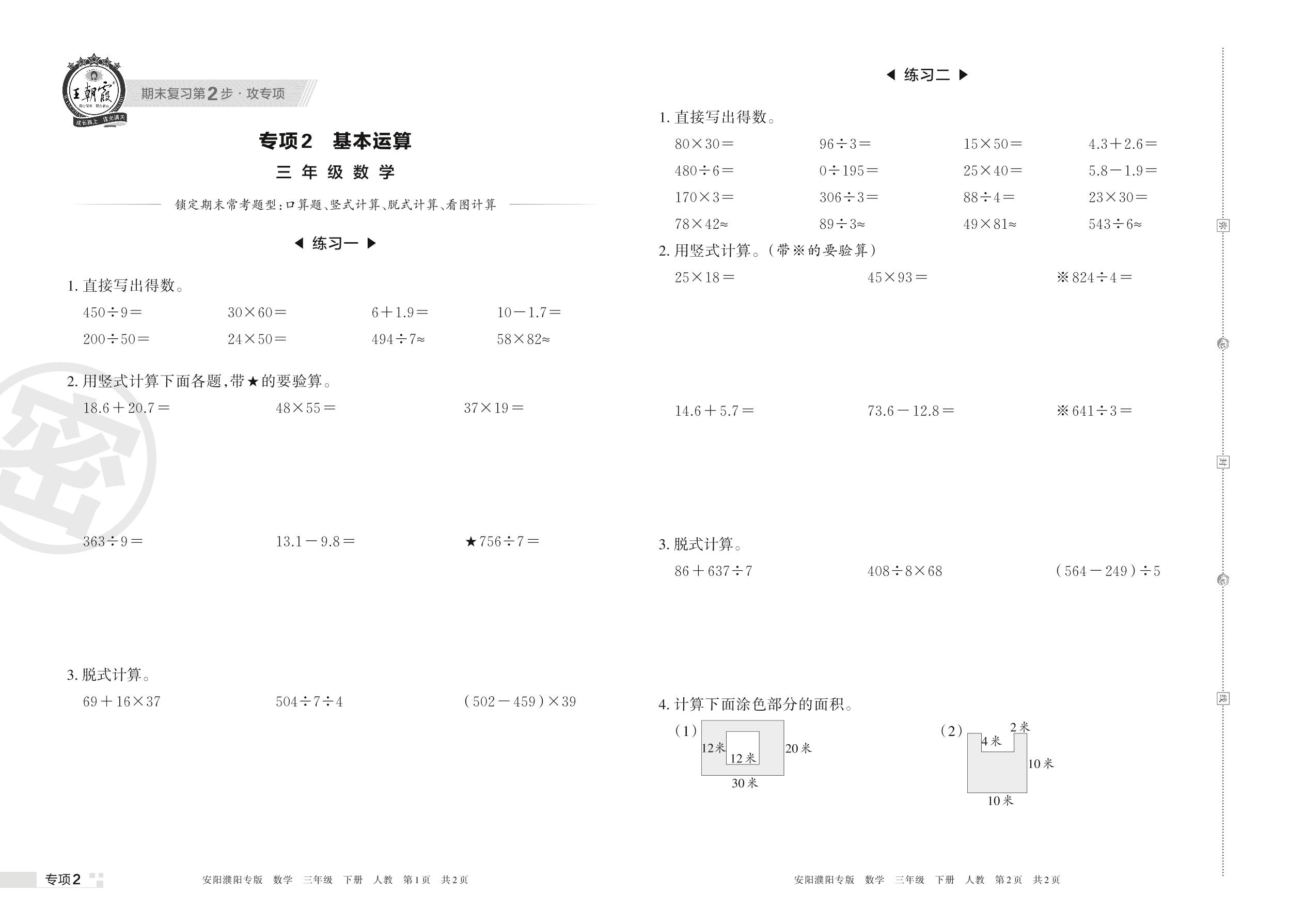 王朝霞期末专项卷——基本运算三年级下册数学(人教版)_R220406143627271【2】