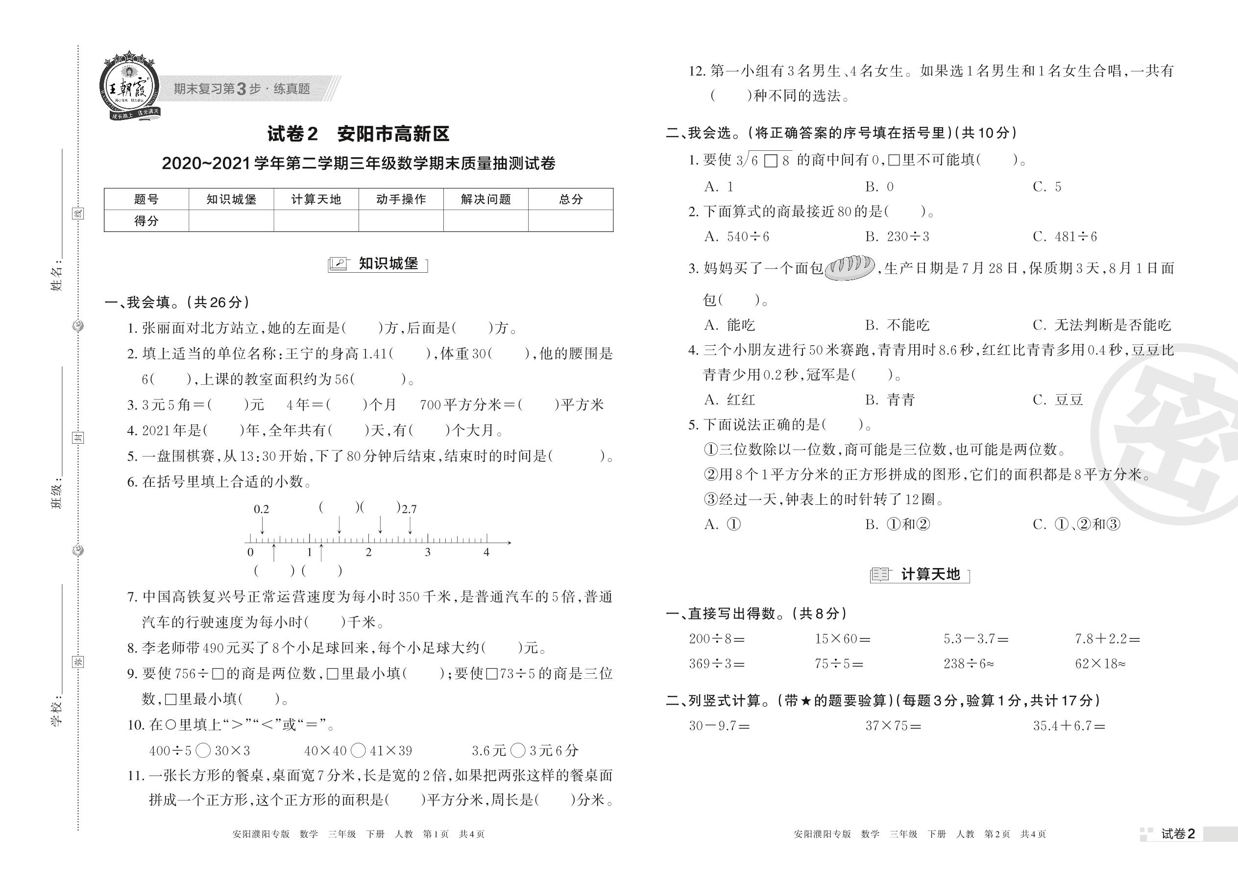 安阳市高新区2020~2021学年第二学期三年级数学期末质量抽测试卷(人教版)【2】