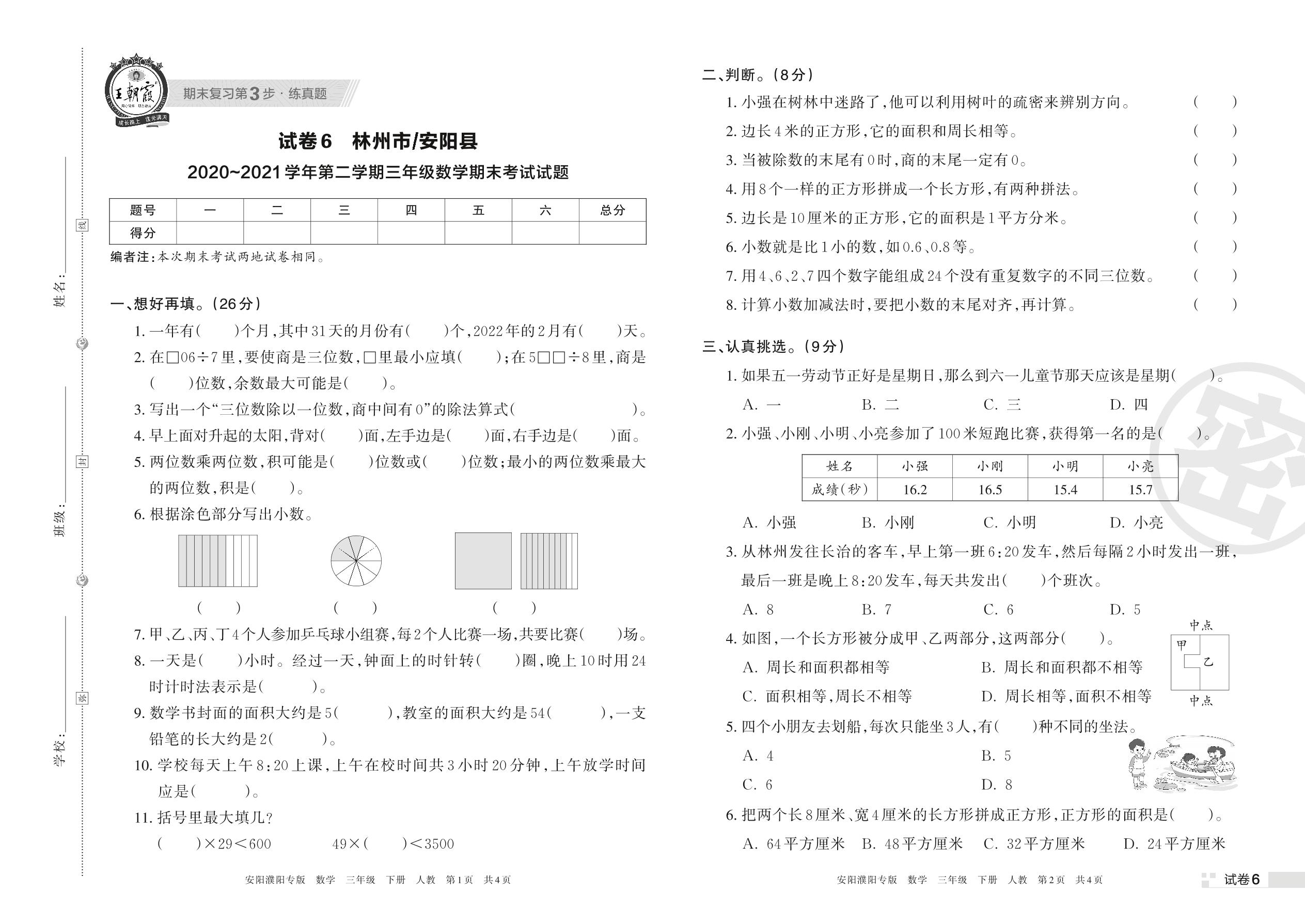 林州市、安阳县2020~2021学年第二学期三年级数学期末考试试题(人教版)【6】