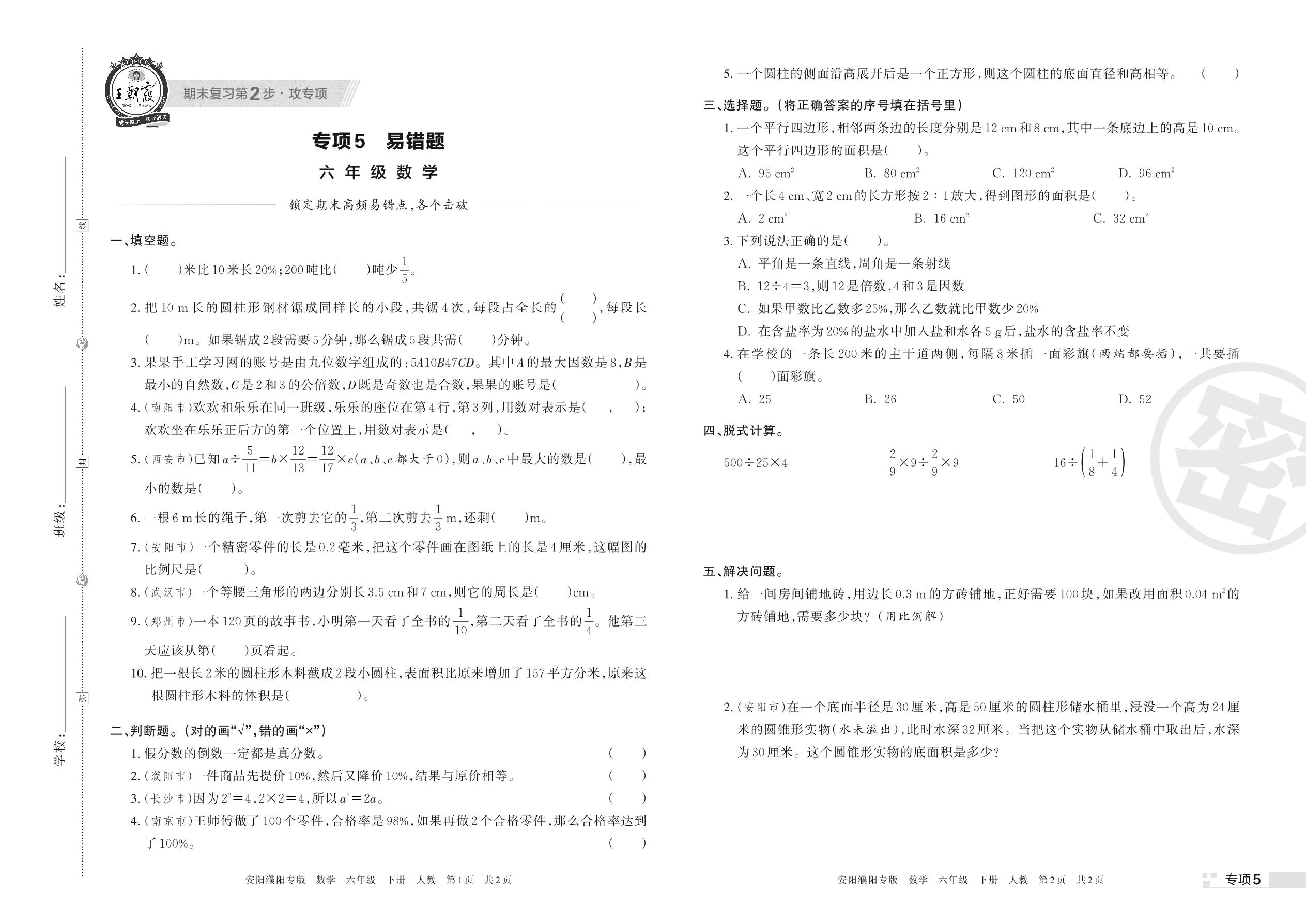 王朝霞期末专项卷——易错题六年级下册数学(人教版)_R220406145413897【5】