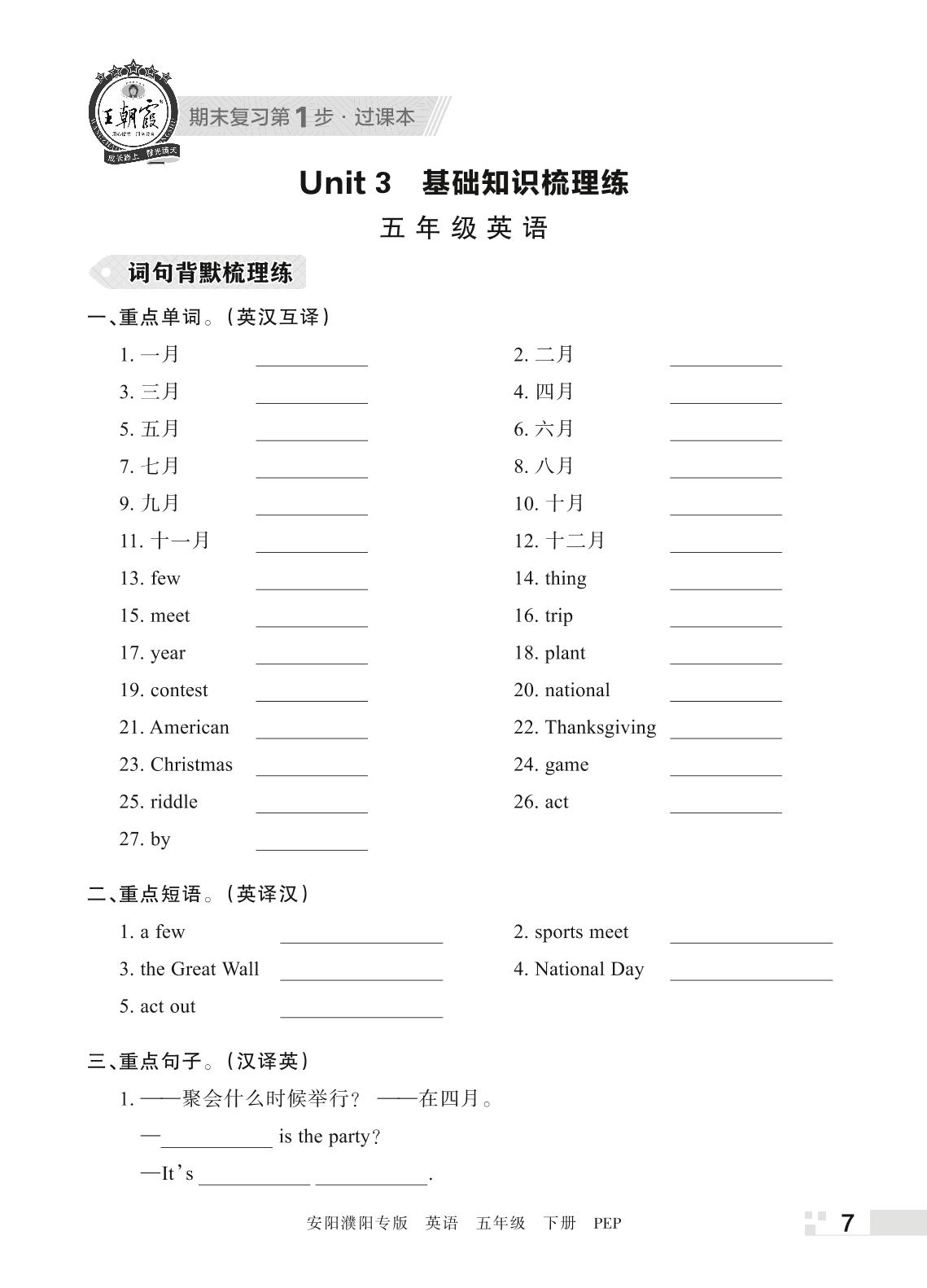 王朝霞期末过课本——Unit 3 基础知识梳理练五年级下册英语(PEP版)_R220406151429687