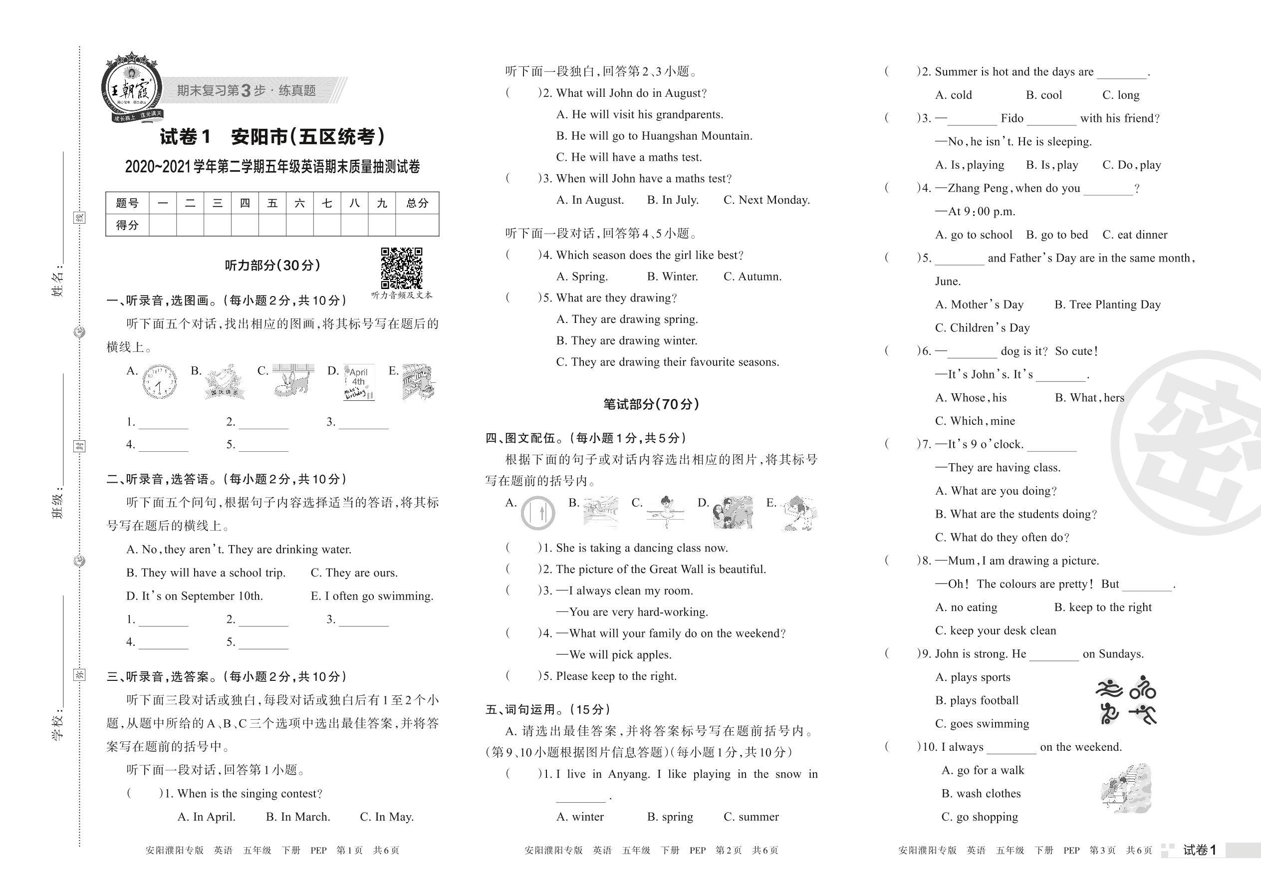 安阳市(五区统考)2020~2021学年第二学期五年级英语期末质量抽测试卷(PEP版)【1】