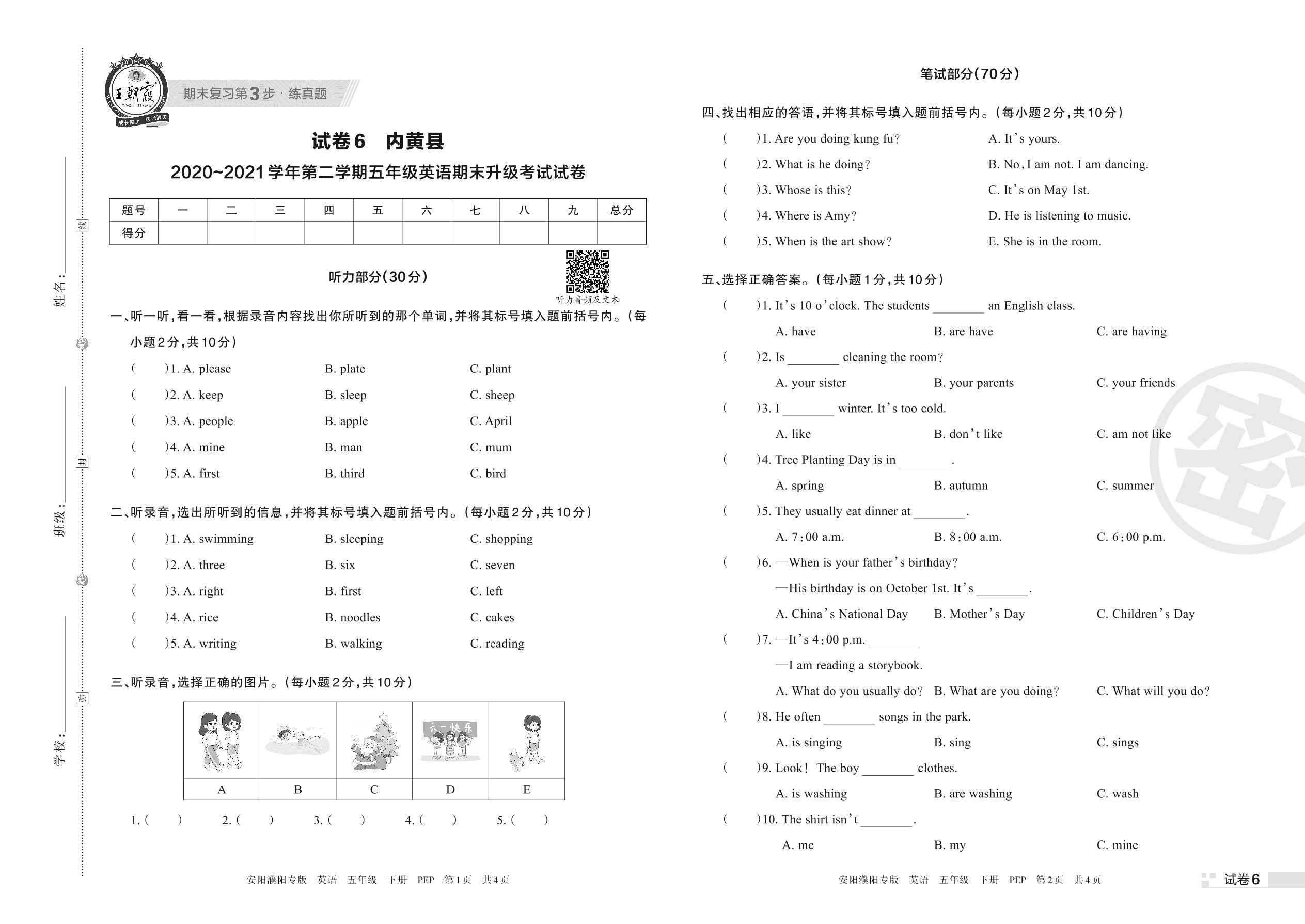 内黄县2020~2021学年第二学期五年级英语期末升级考试试卷(PEP版)【6】