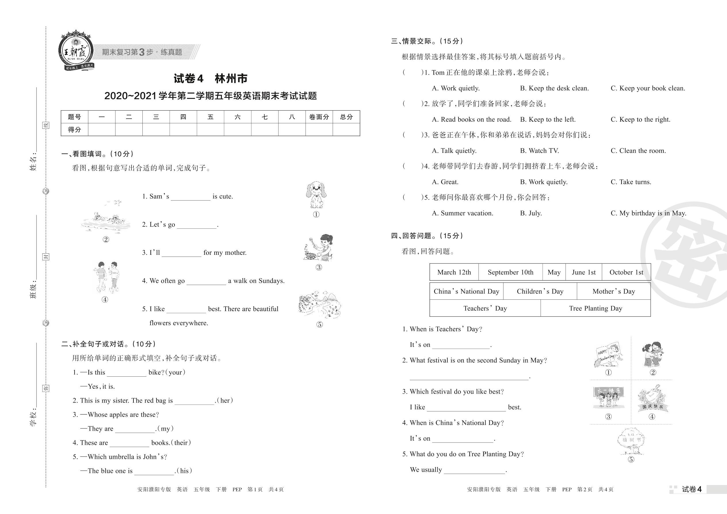 林州市2020~2021学年第二学期五年级英语期末考试试题(PEP版)【4】