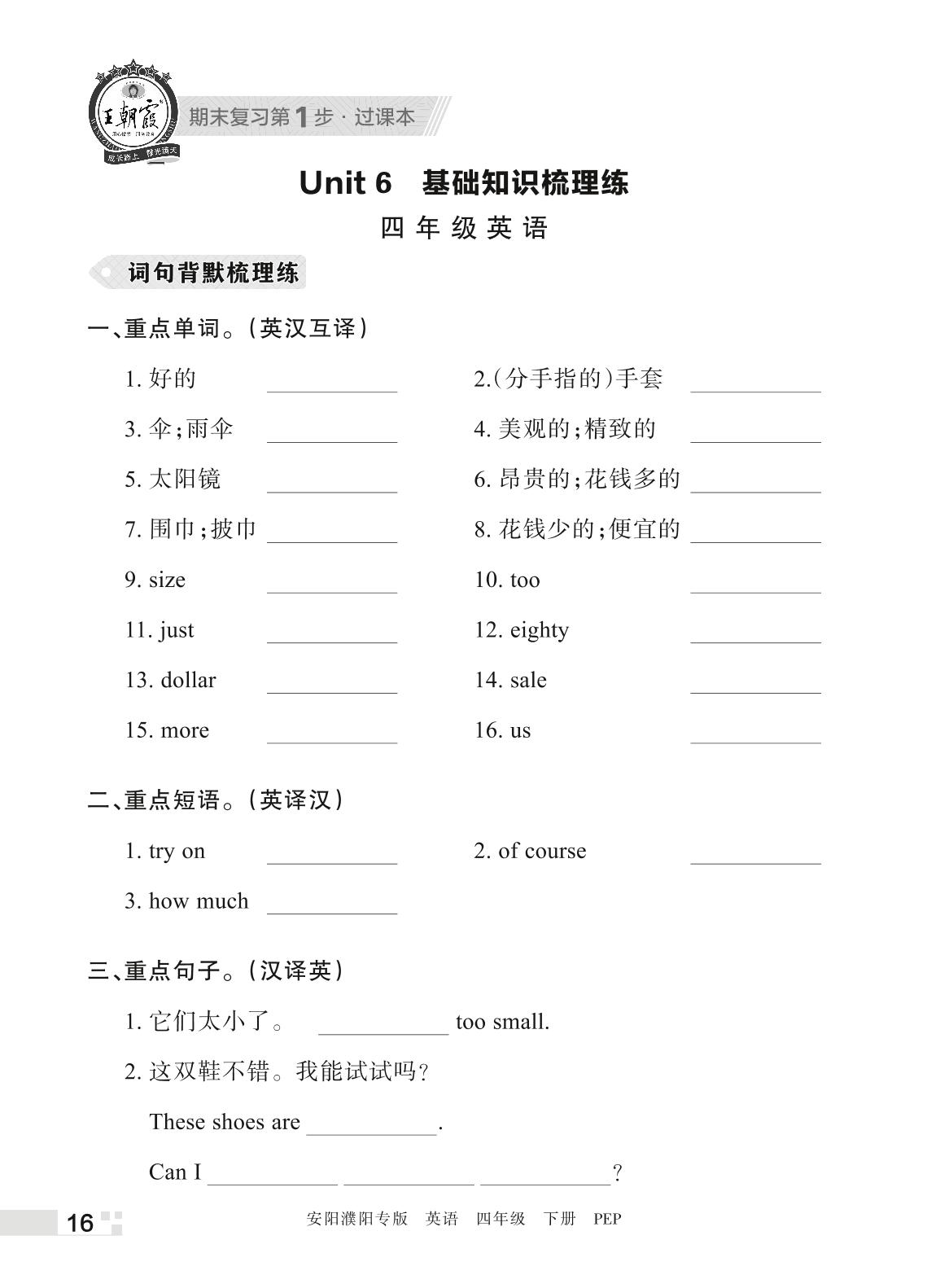 王朝霞期末过课本——Unit 6 基础知识梳理练四年级下册英语(PEP版)_R220406153056546