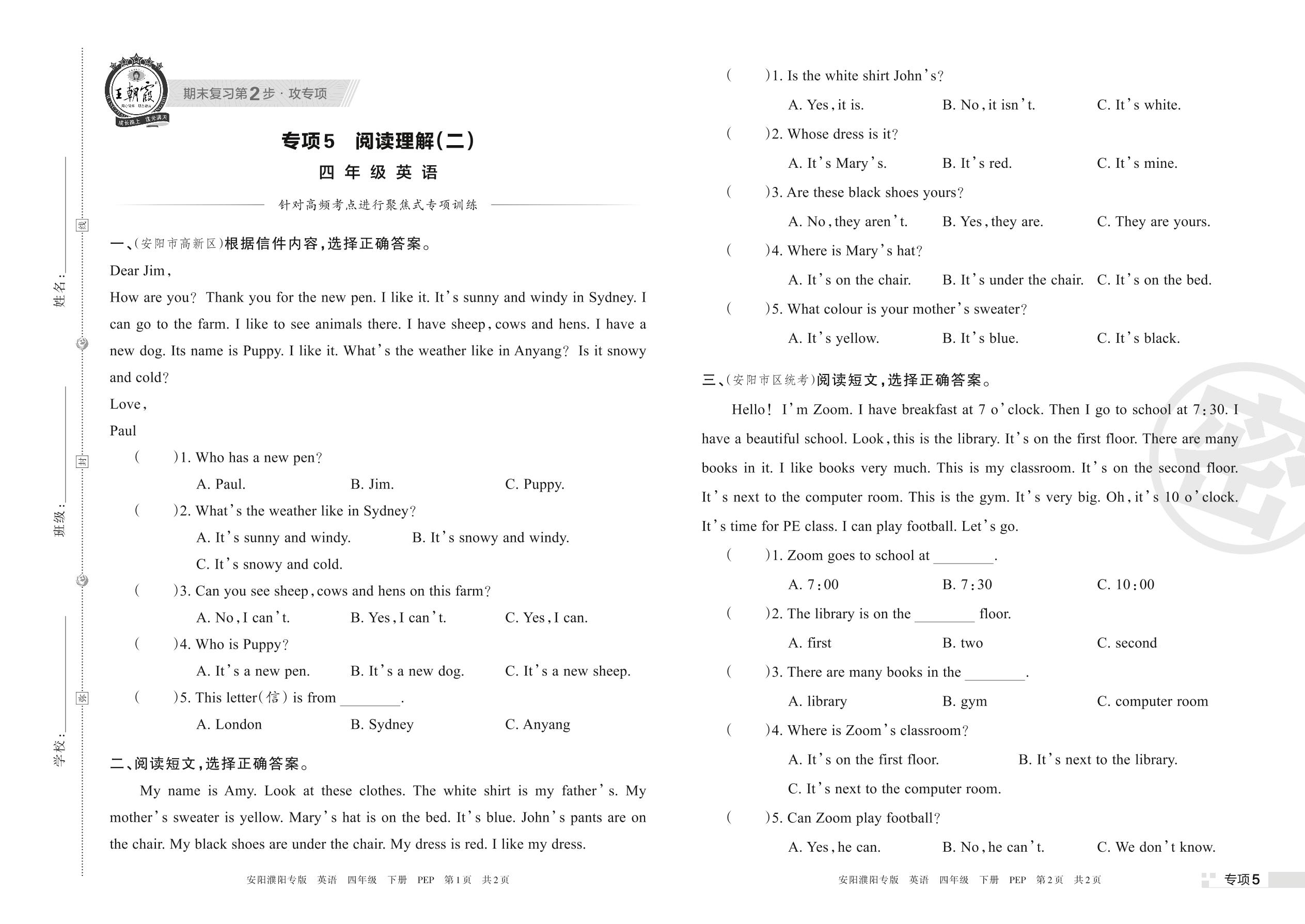 王朝霞期末专项卷——阅读理解(二)四年级下册英语(PEP版)【5】