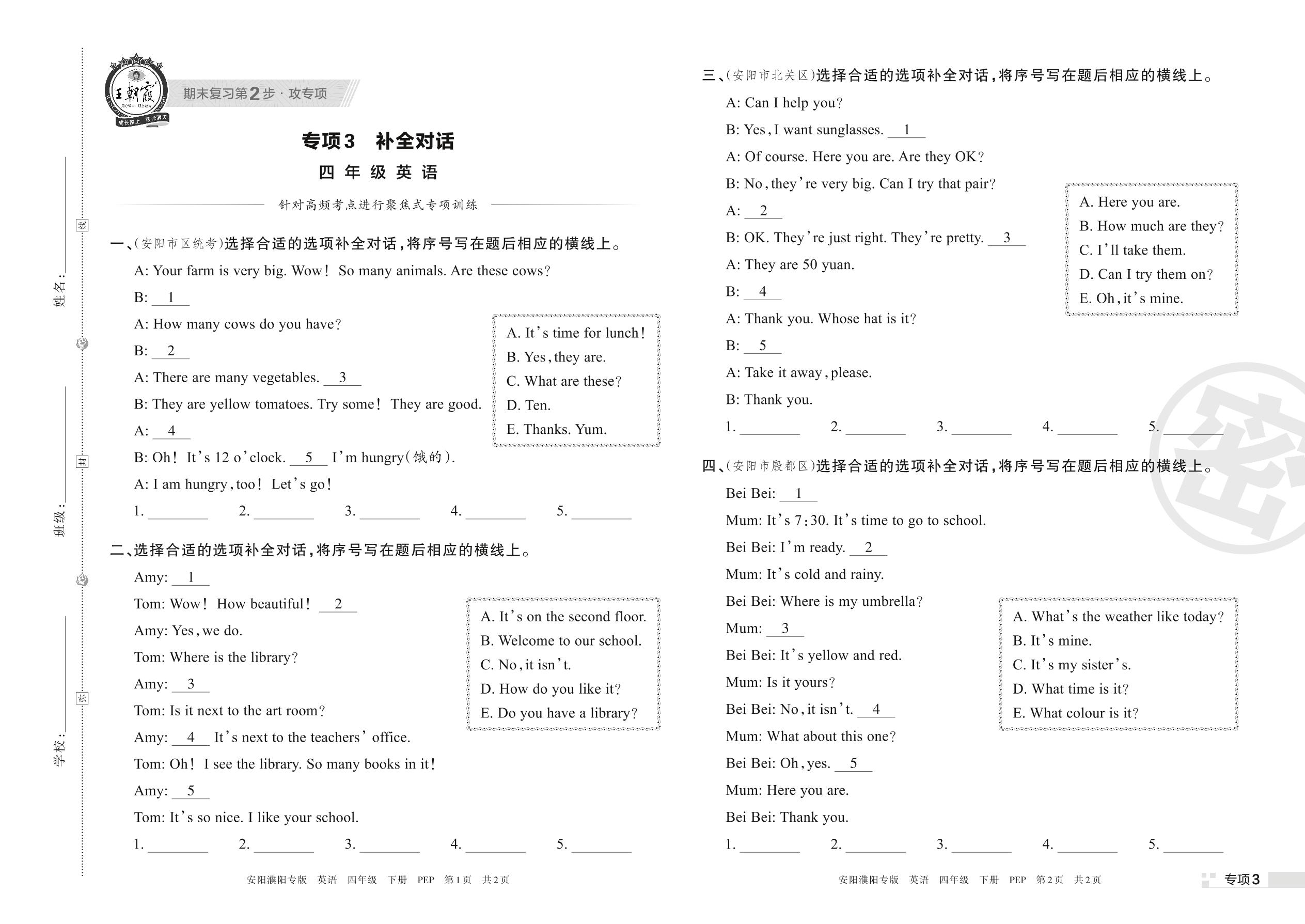 王朝霞期末专项卷——补全对话四年级下册英语(PEP版)【3】