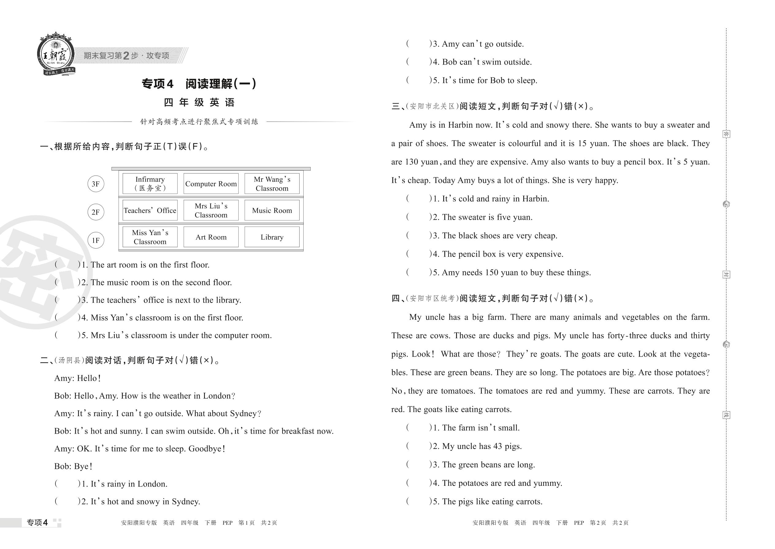 王朝霞期末专项卷——阅读理解(一)四年级下册英语(PEP版)【4】