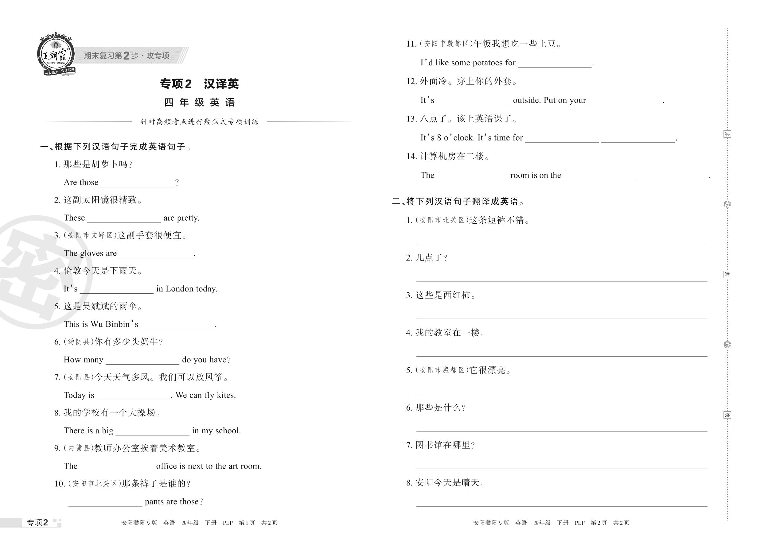 王朝霞期末专项卷——汉译英四年级下册英语(PEP版)【2】
