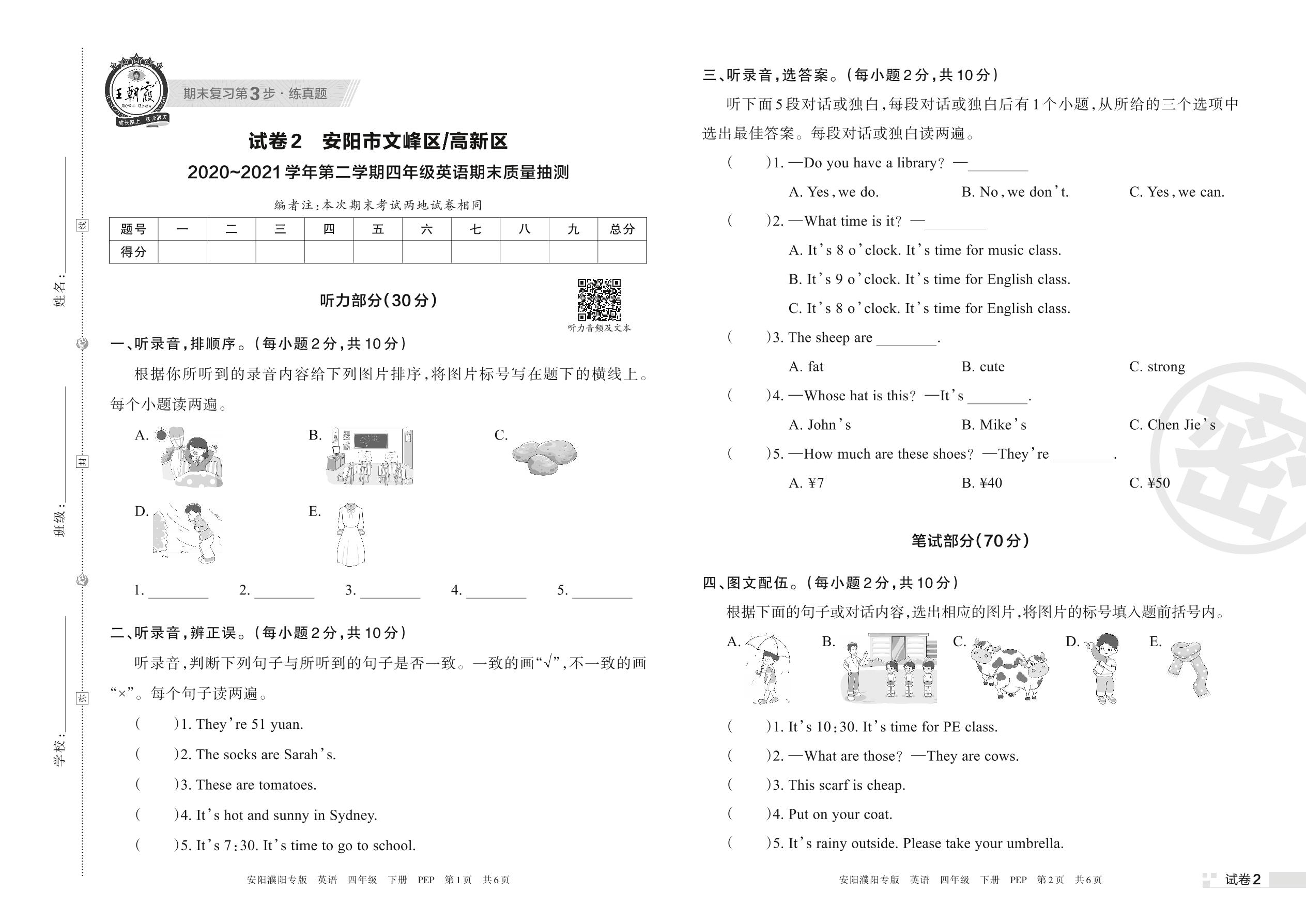 安阳市文峰区、高新区2020~2021学年第二学期四年级英语期末质量抽测(PEP版)【2】