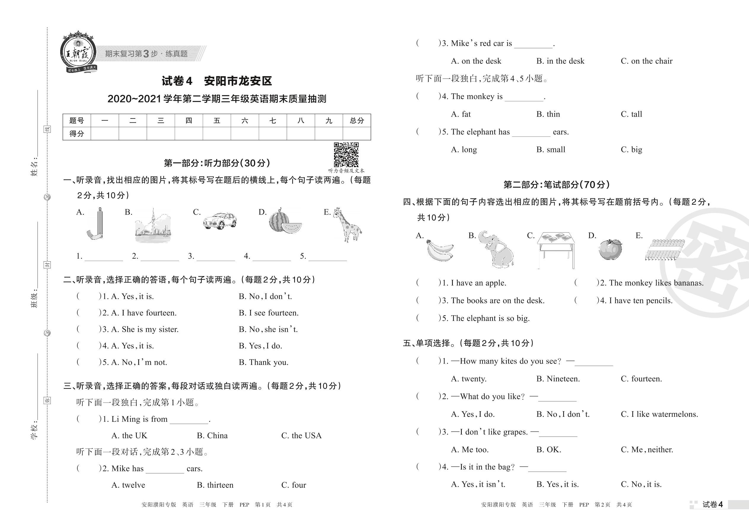 安阳市龙安区2020~2021学年第二学期三年级英语期末质量抽测(PEP版)【4】