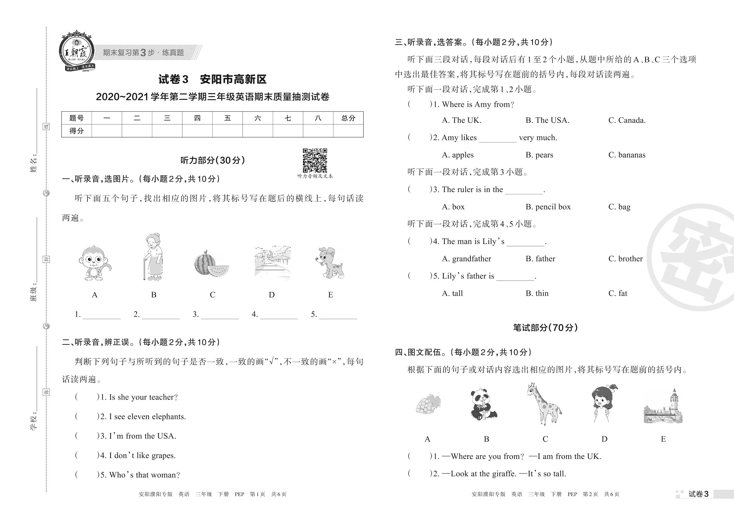 安阳市高新区2020~2021学年第二学期三年级英语期末质量抽测试卷(PEP版)【3】