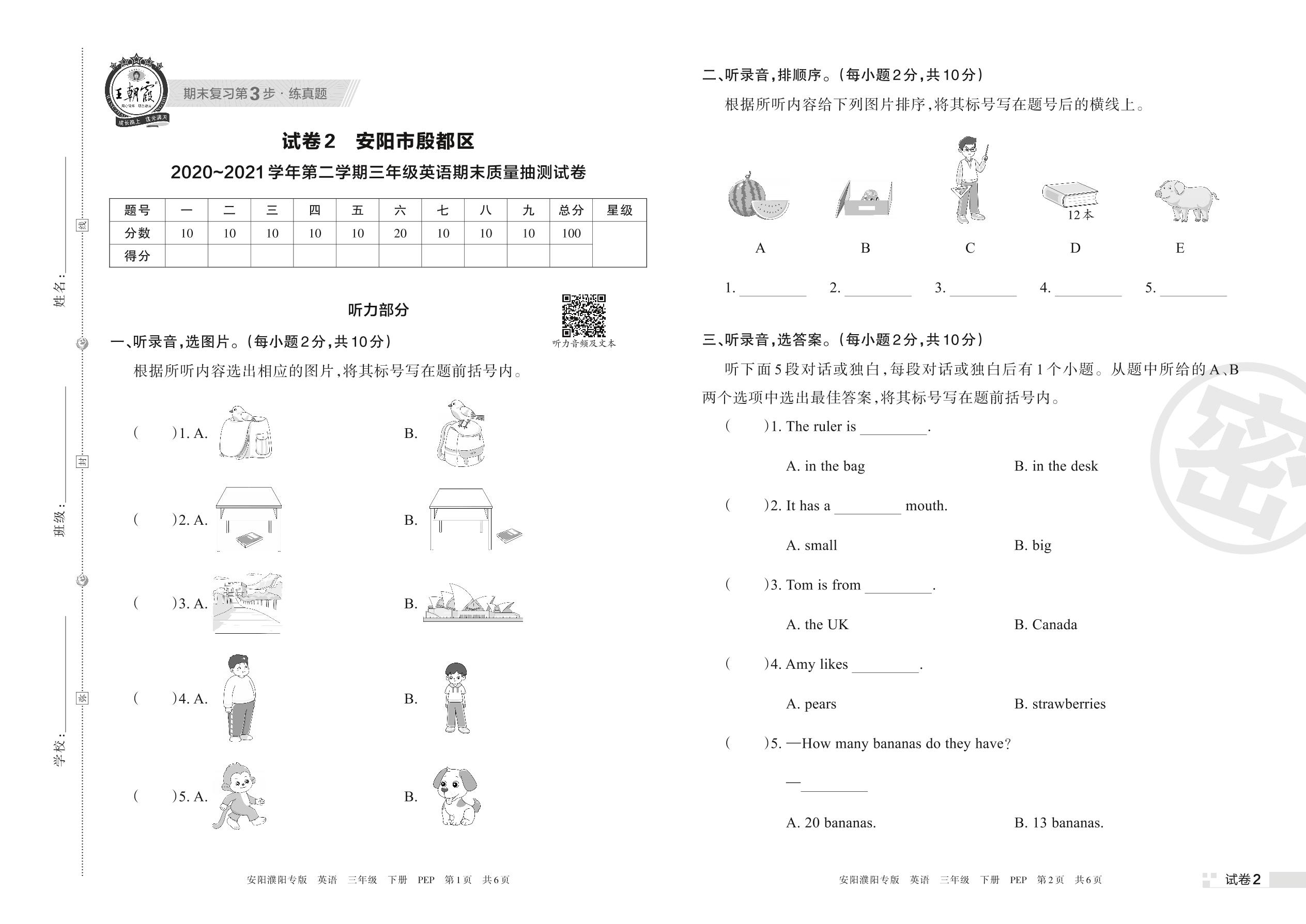 安阳市殷都区2020~2021学年第二学期三年级英语期末质量抽测试卷(PEP版)【2】