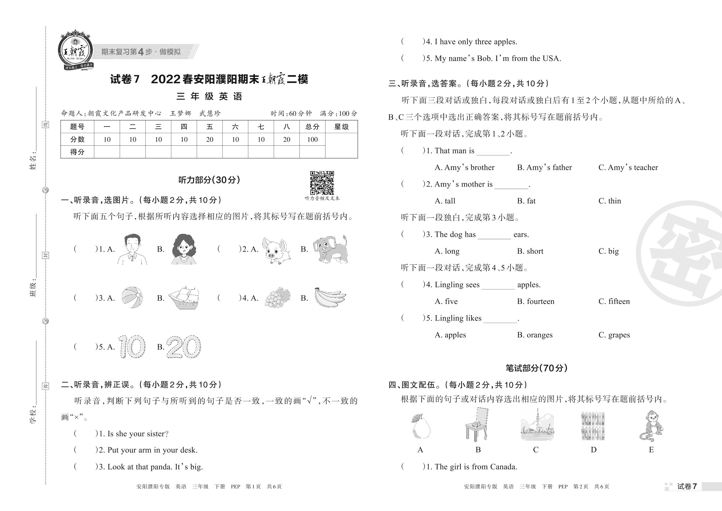 王朝霞期末模拟卷三年级下册英语(PEP版)_R220406160949399【7】
