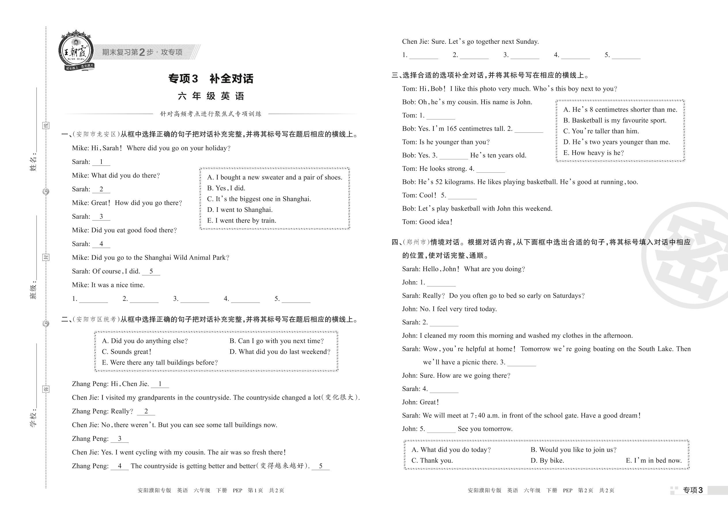 王朝霞期末专项卷——补全对话六年级下册英语(PEP版)【3】