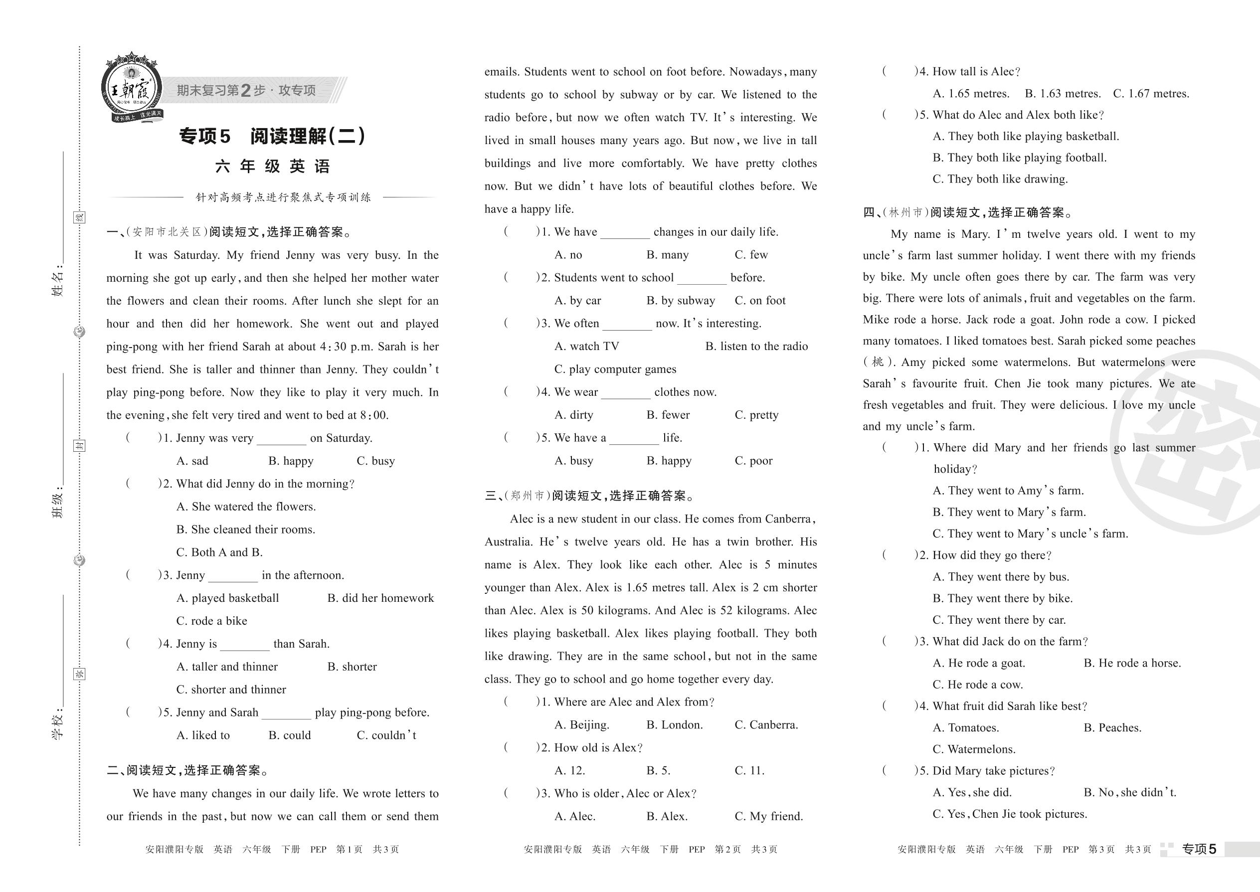 王朝霞期末专项卷——阅读理解(二)六年级下册英语(PEP版)【5】