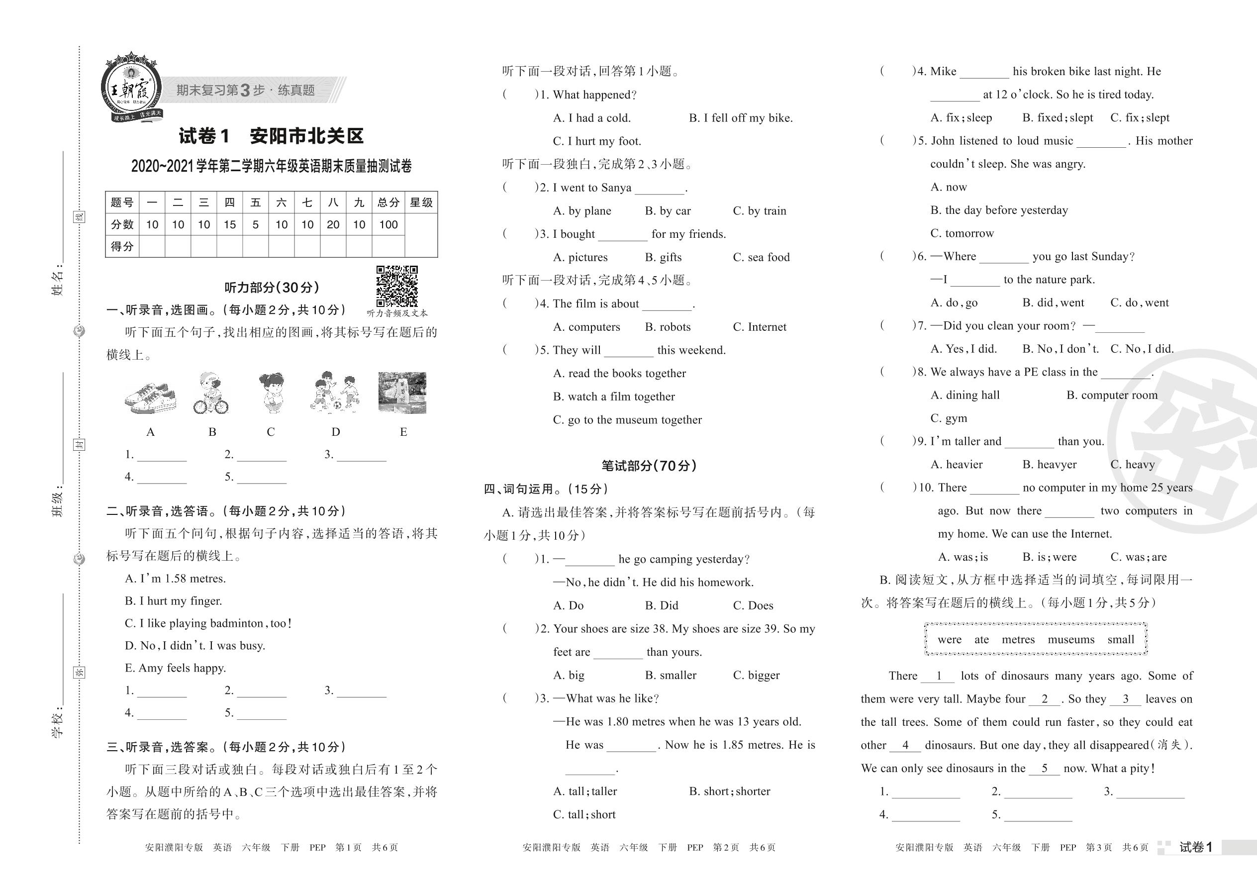 安阳市北关区2020~2021学年第二学期六年级英语期末质量抽测试卷(PEP版)【1】