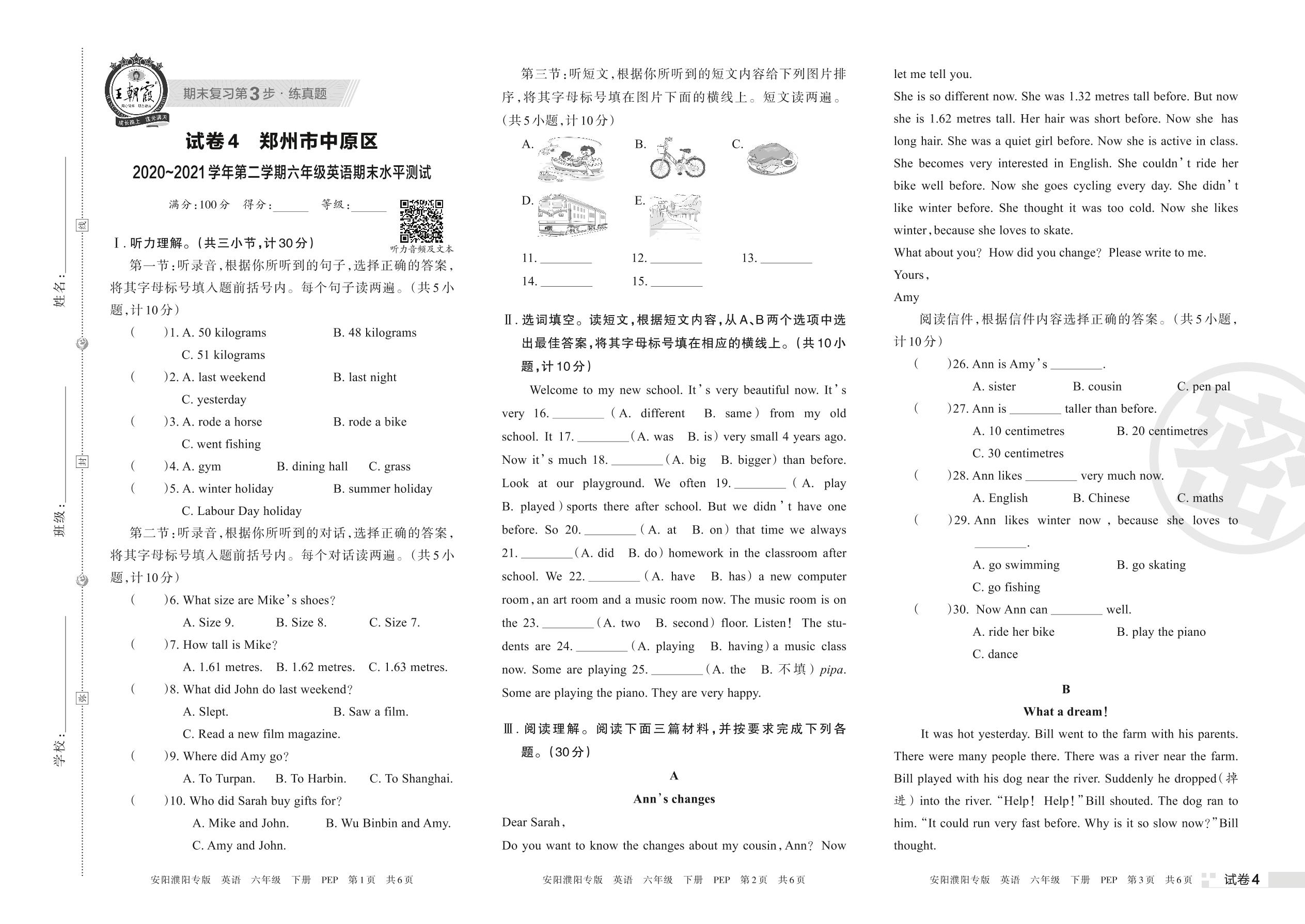 郑州市中原区2020~2021学年第二学期六年级英语期末水平测试(PEP版)【4】