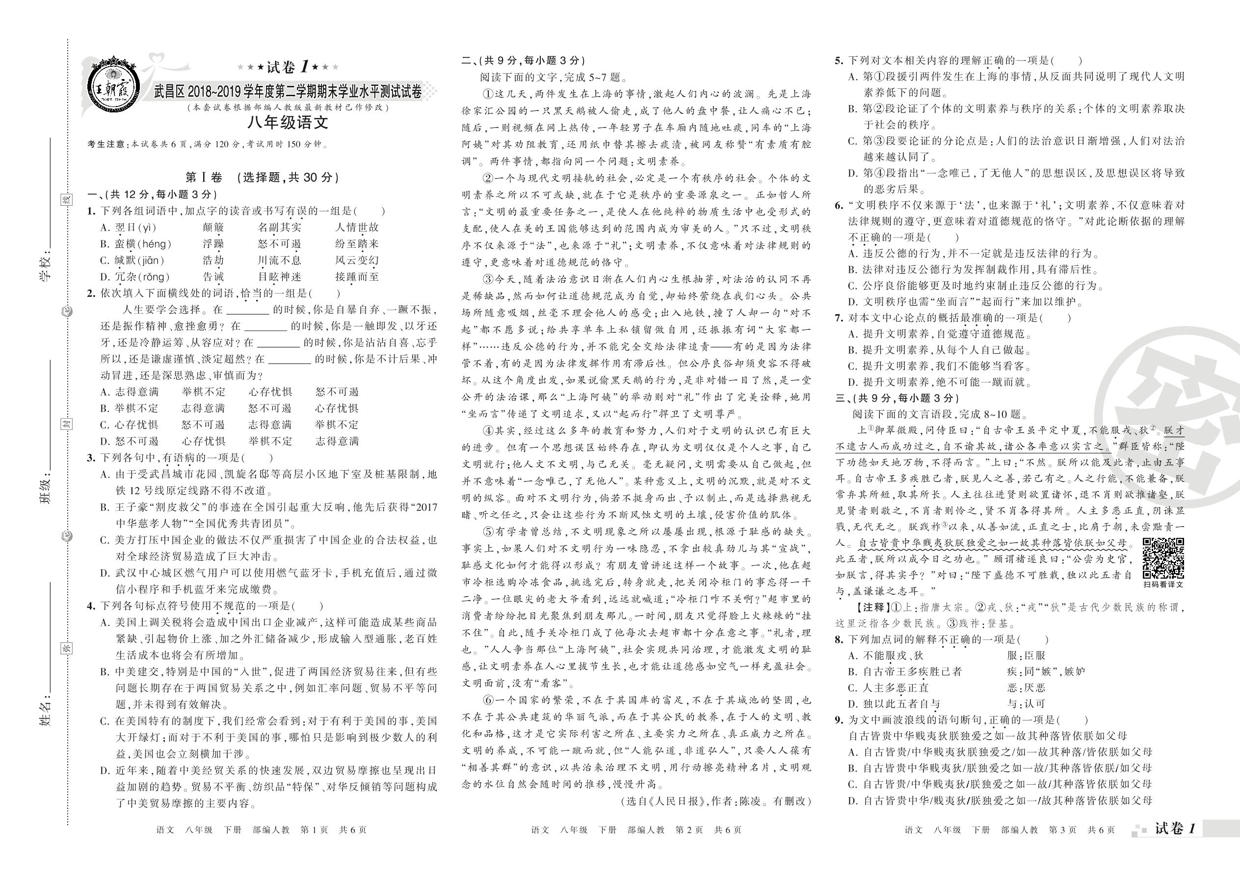 2018-2019学年第二学期武汉市武昌区八年级语文试卷(人教版)【1】