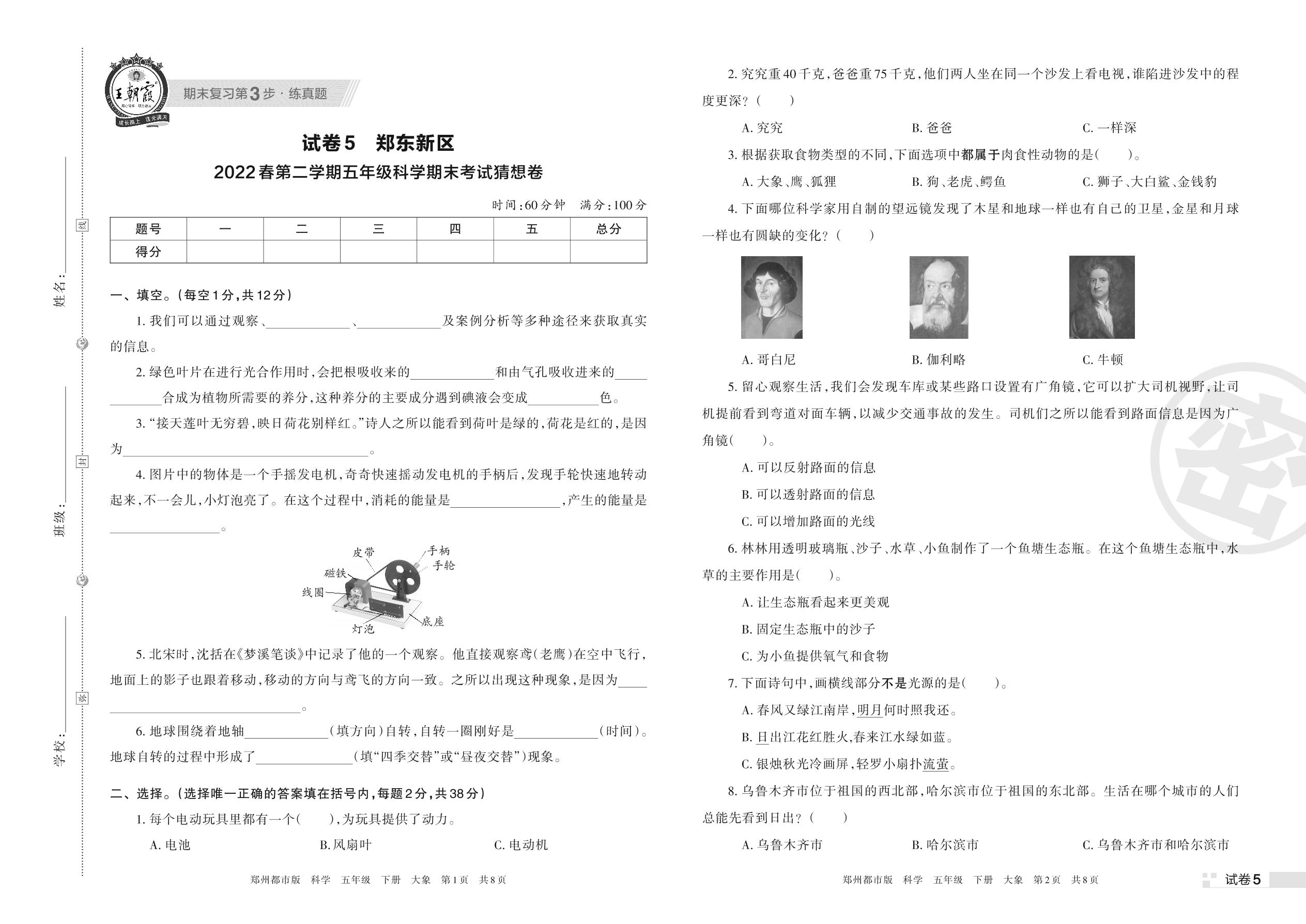 郑东新区2022春第二学期五年级科学期末考试猜想卷(大象版)【5】