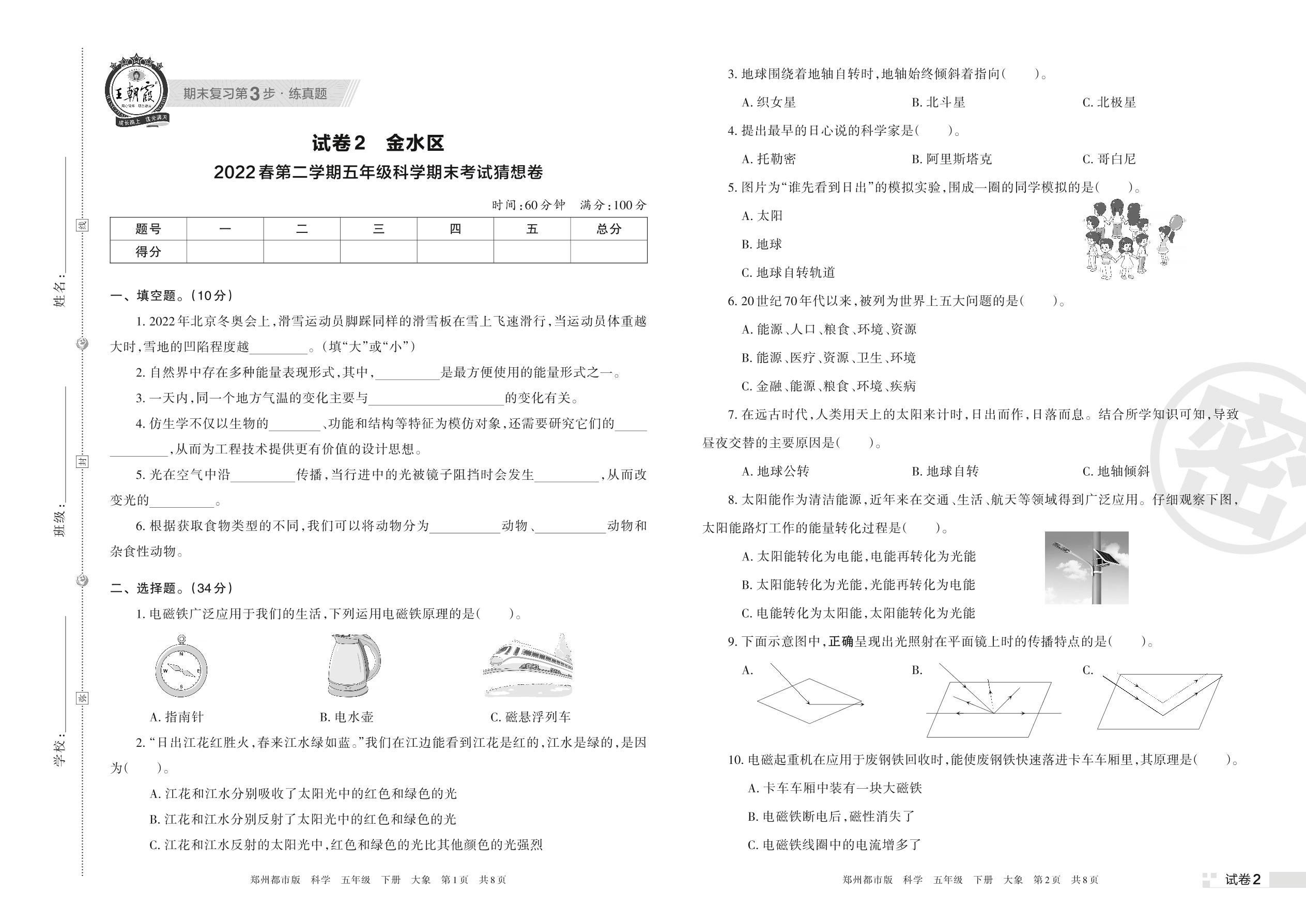 金水区2022春第二学期五年级科学期末考试猜想卷(大象版)【2】