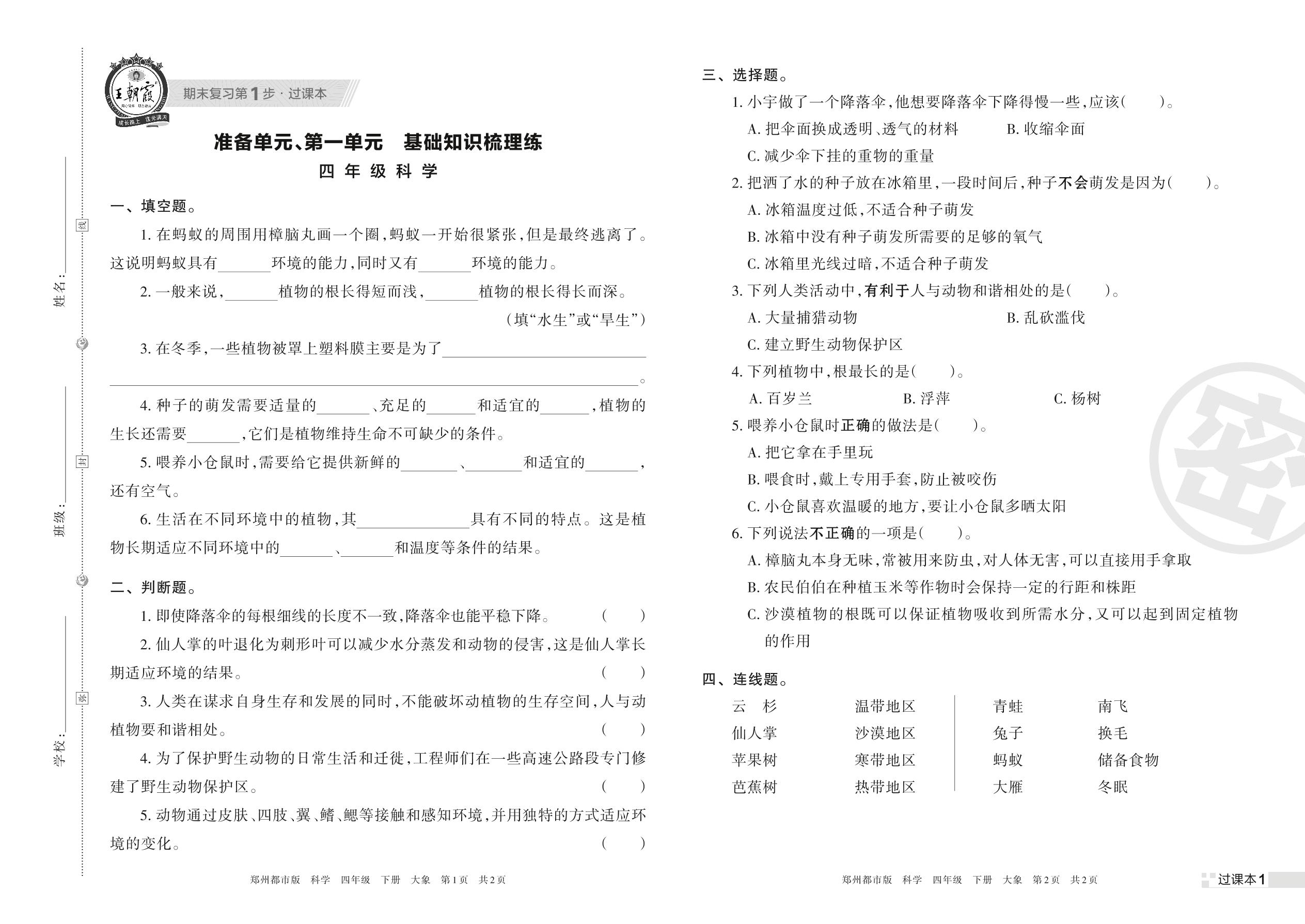 王朝霞期末过课本——准备单元、第一单元 基础知识梳理练四年级下册科学(大象版)