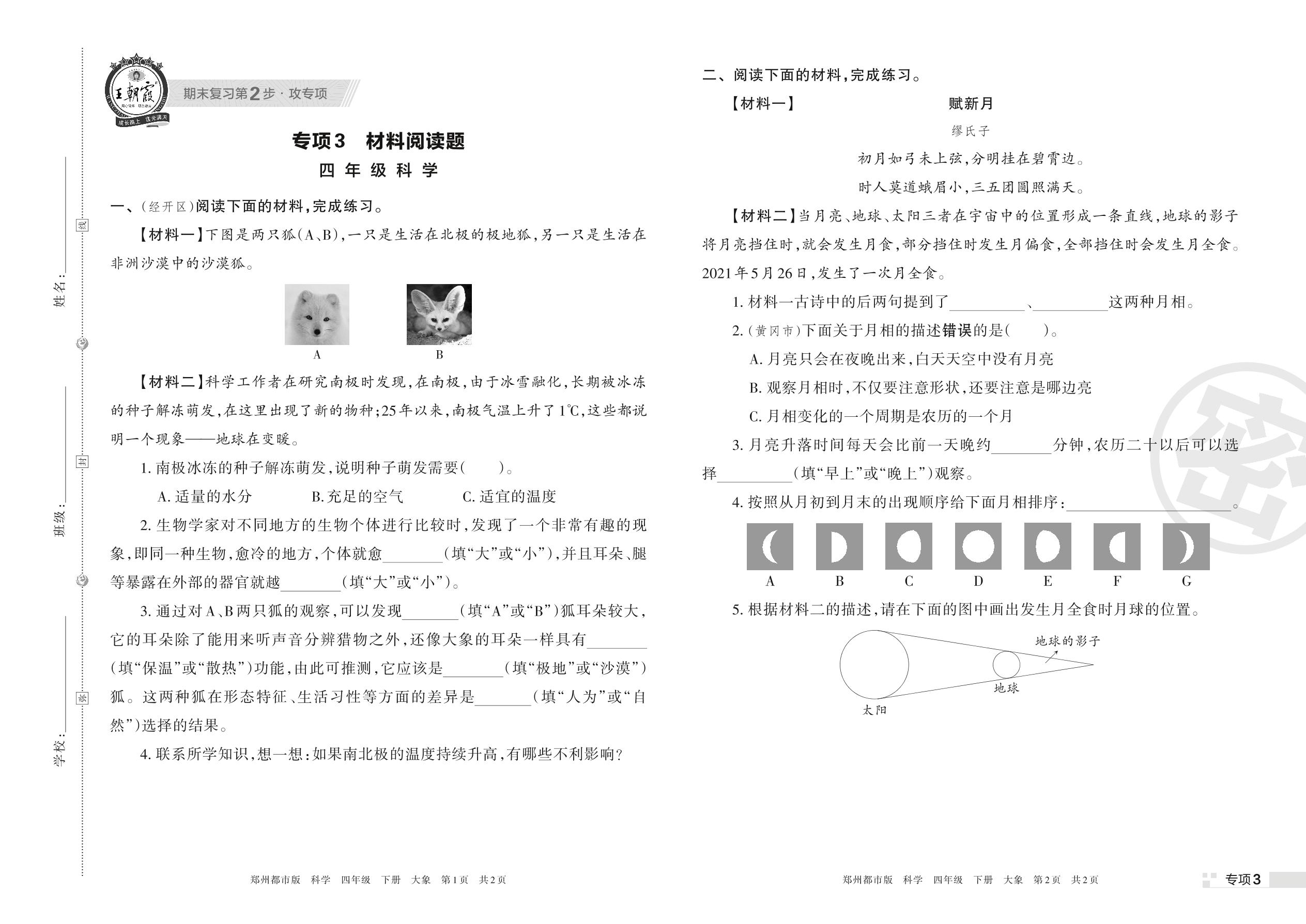 王朝霞期末专项卷——材料阅读题四年级下册科学(大象版)【3】