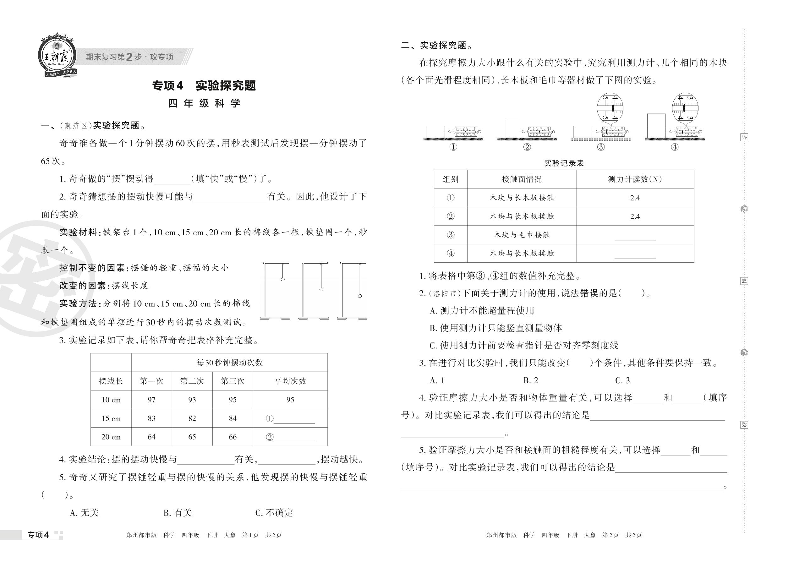 王朝霞期末专项卷——实验探究题四年级下册科学(大象版)【4】