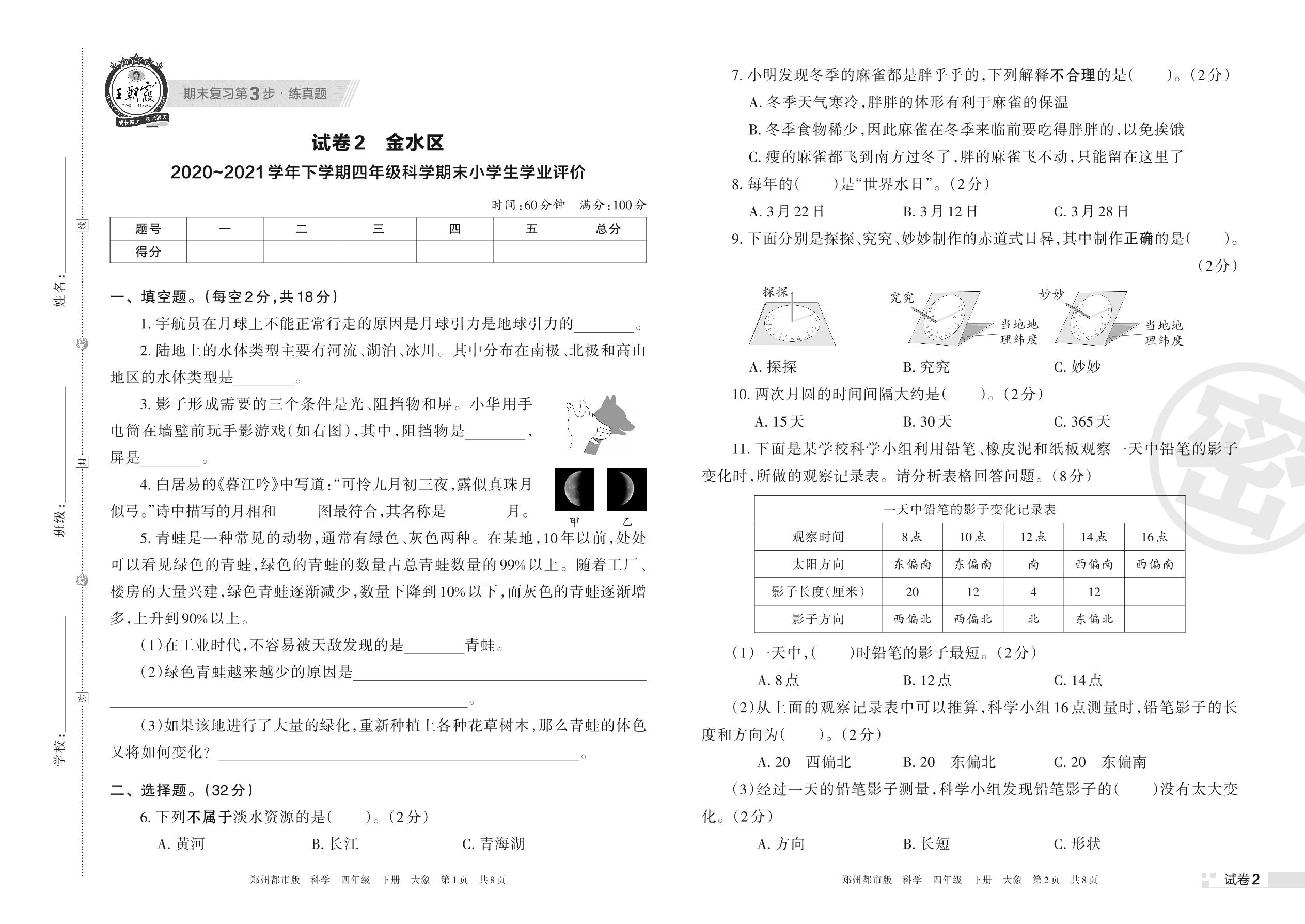 金水区2020~2021学年下学期四年级科学期末小学生学业评价(大象版)【2】