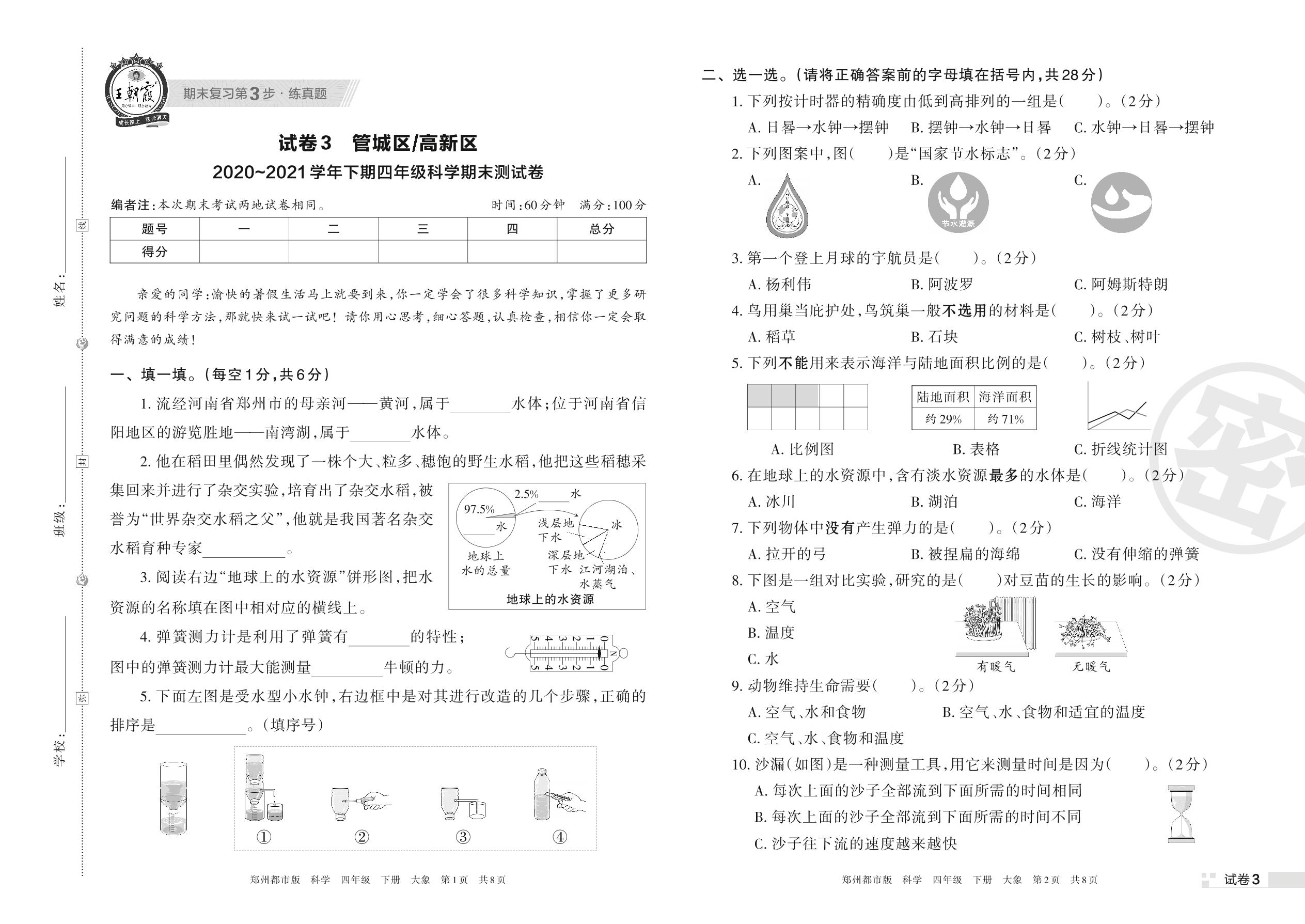 管城区、高新区2020~2021学年下期四年级科学期末测试卷(大象版)【3】