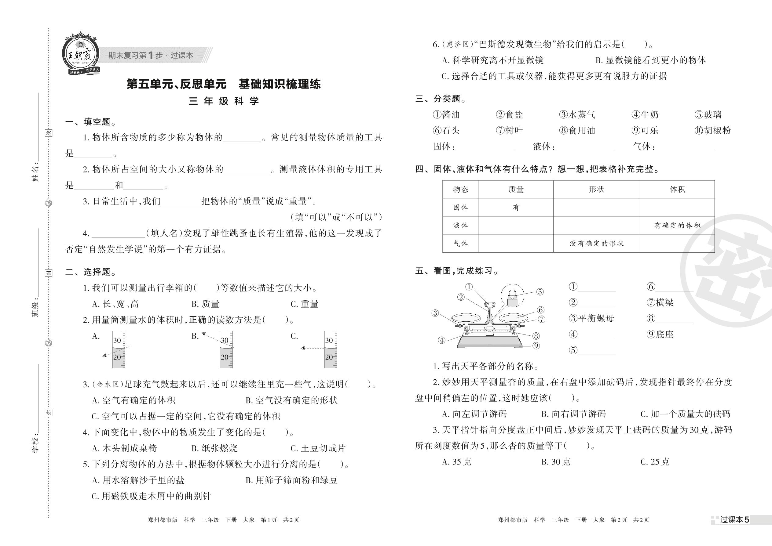 王朝霞期末过课本——第五单元、反思单元 基础知识梳理练三年级下册科学(大象版)