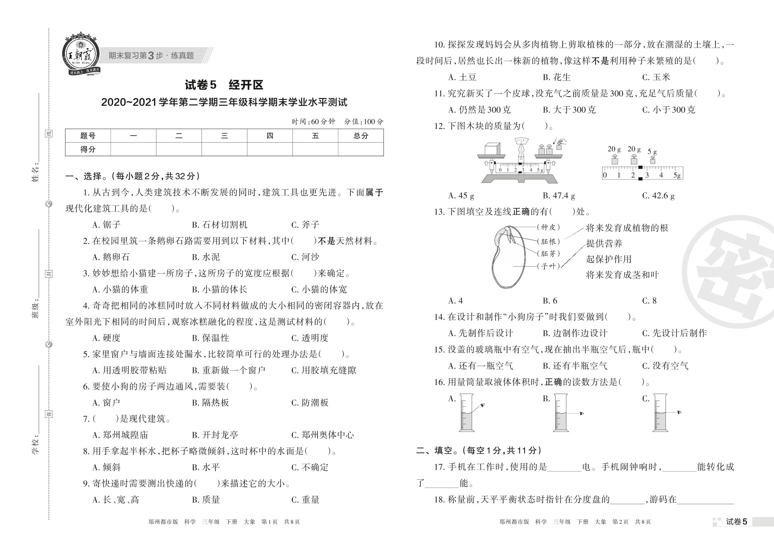 经开区2020~2021学年第二学期三年级科学期末学业水平测试(大象版)【5】