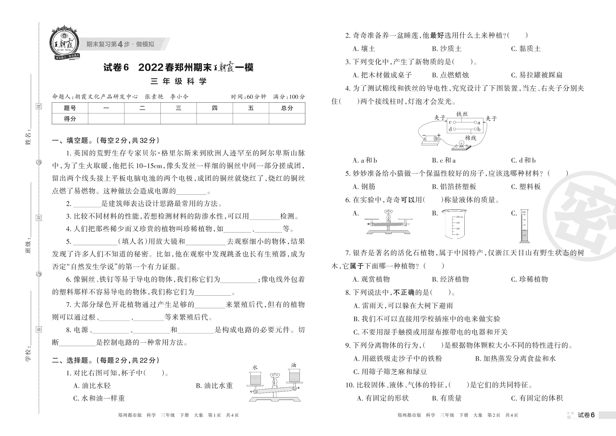 王朝霞期末模拟卷三年级下册科学(大象版)【6】