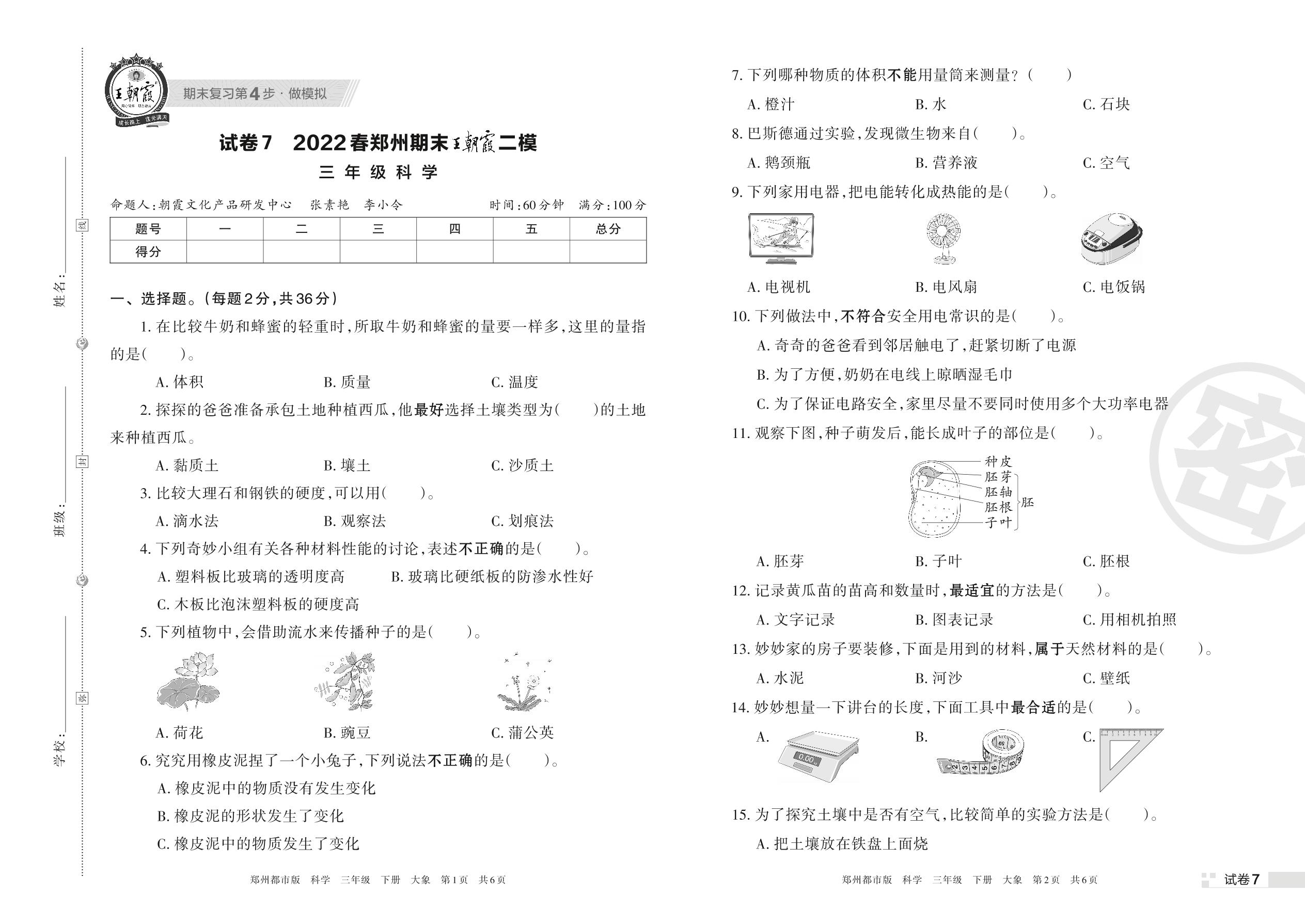 王朝霞期末模拟卷三年级下册科学(大象版)【7】