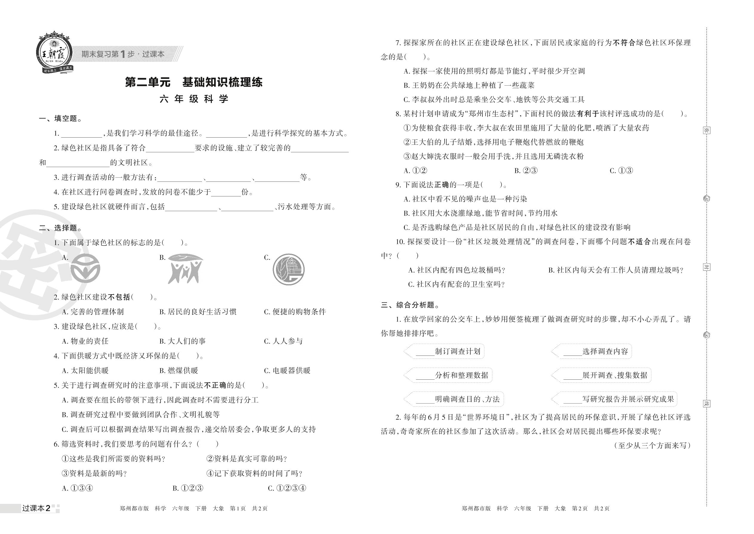 王朝霞期末过课本——第二单元 基础知识梳理练六年级下册科学(大象版)
