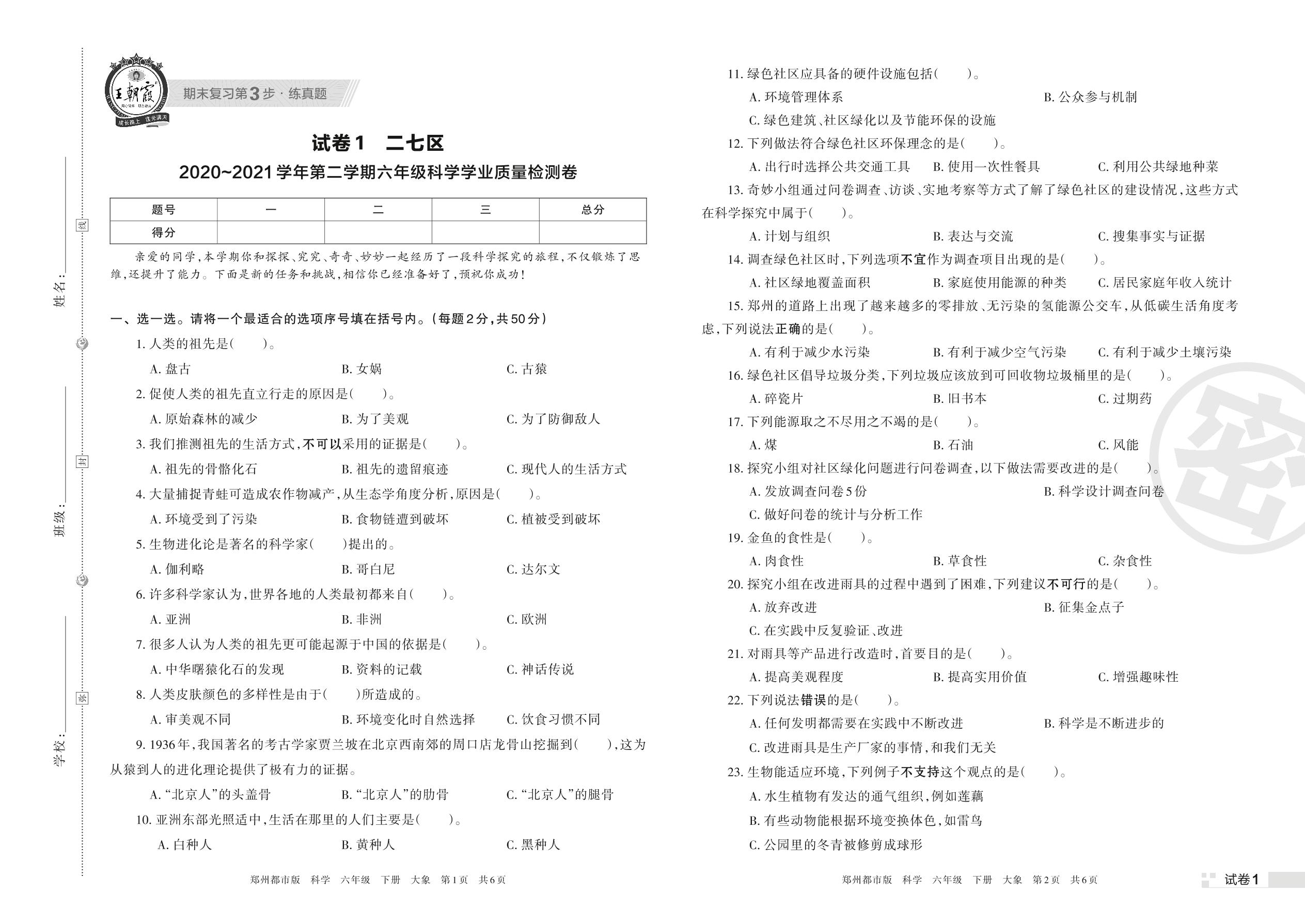 二七区2020~2021学年第二学期六年级科学学业质量检测卷(大象版)【1】