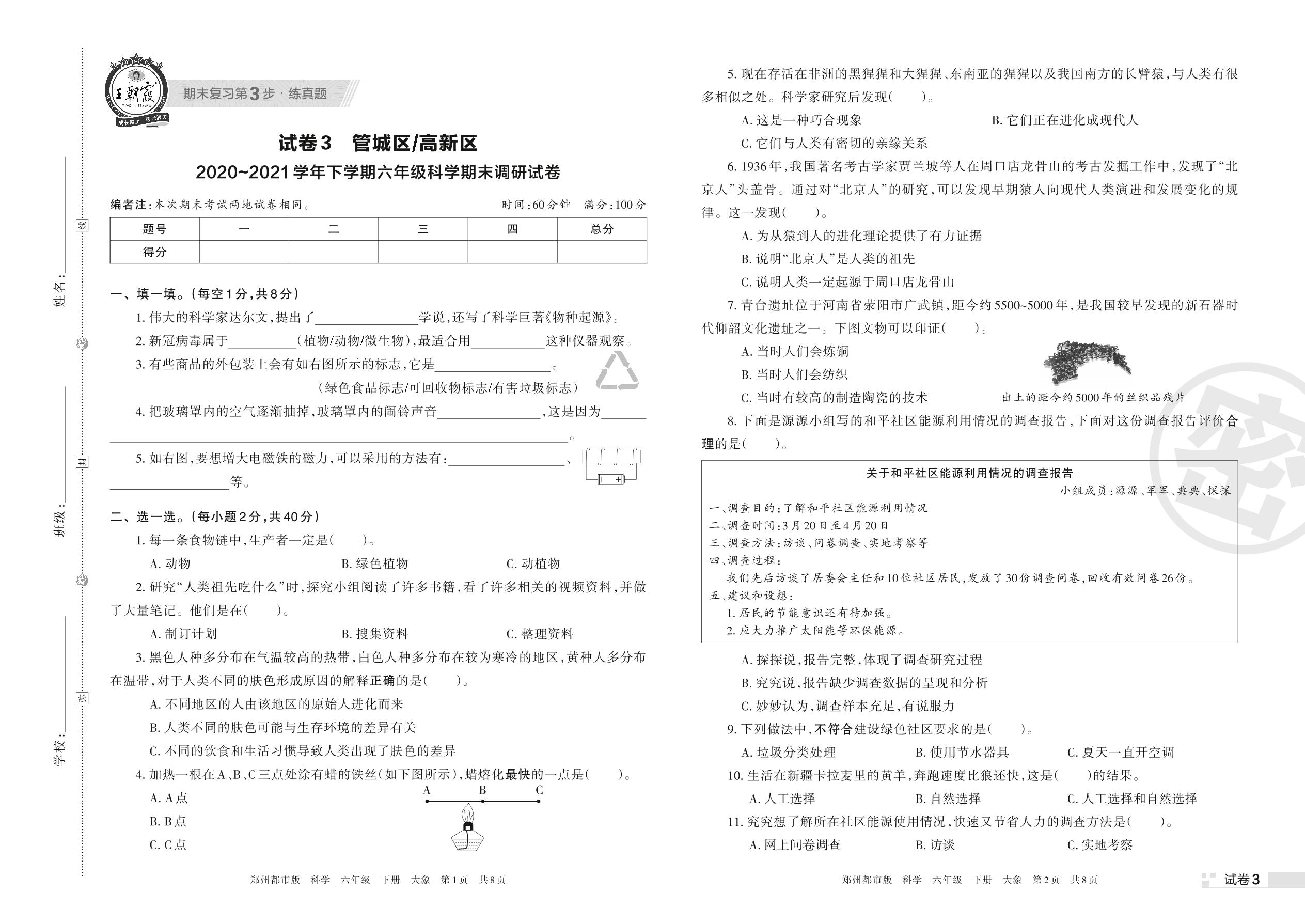管城区、高新区2020~2021学年下学期六年级科学期末调研试卷(大象版)【3】