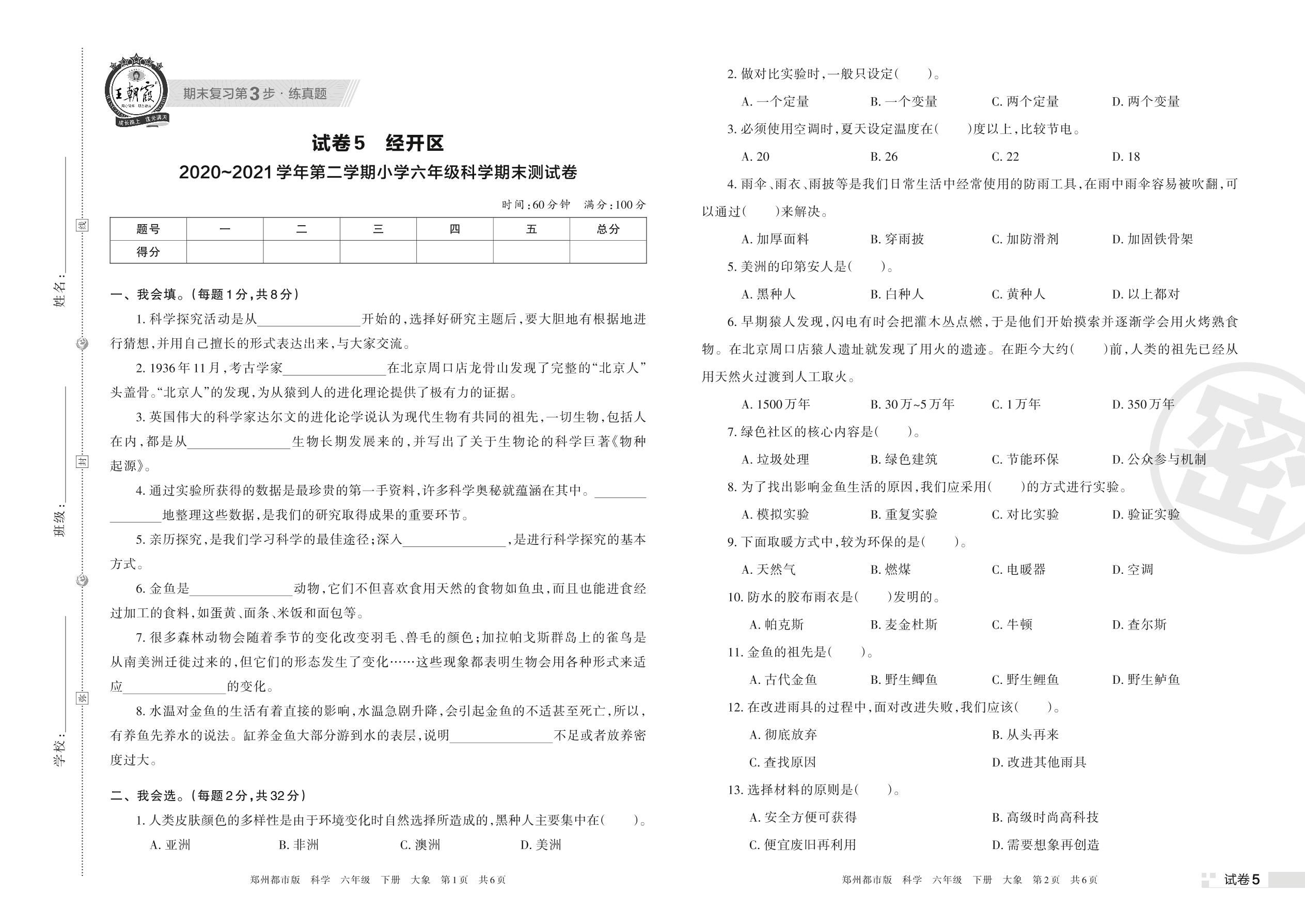 经开区2020~2021学年第二学期小学六年级科学期末测试卷(大象版)【5】