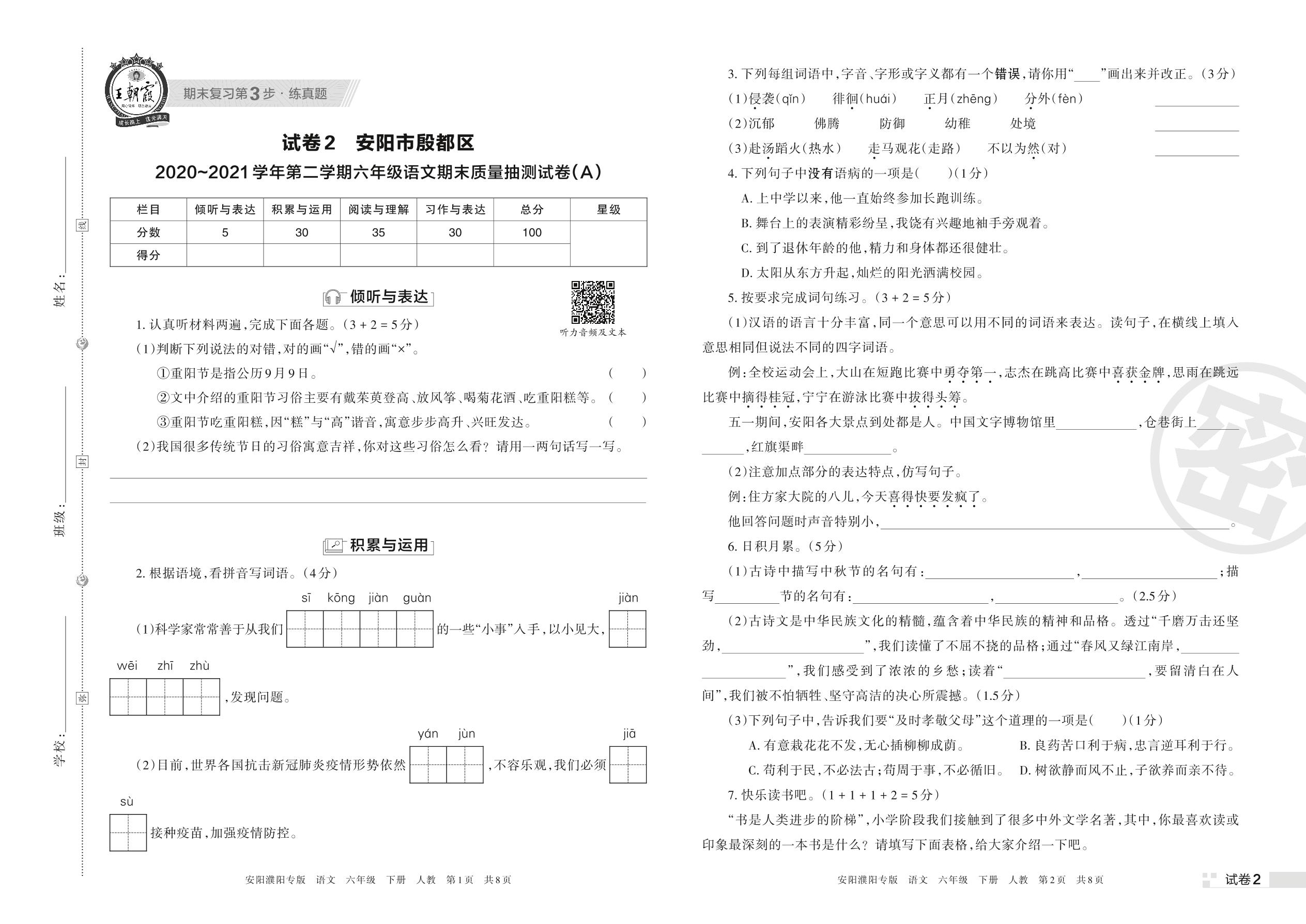 安阳市殷都区2020~2021学年第二学期六年级语文期末质量抽测试卷(A)(人教版)【2】
