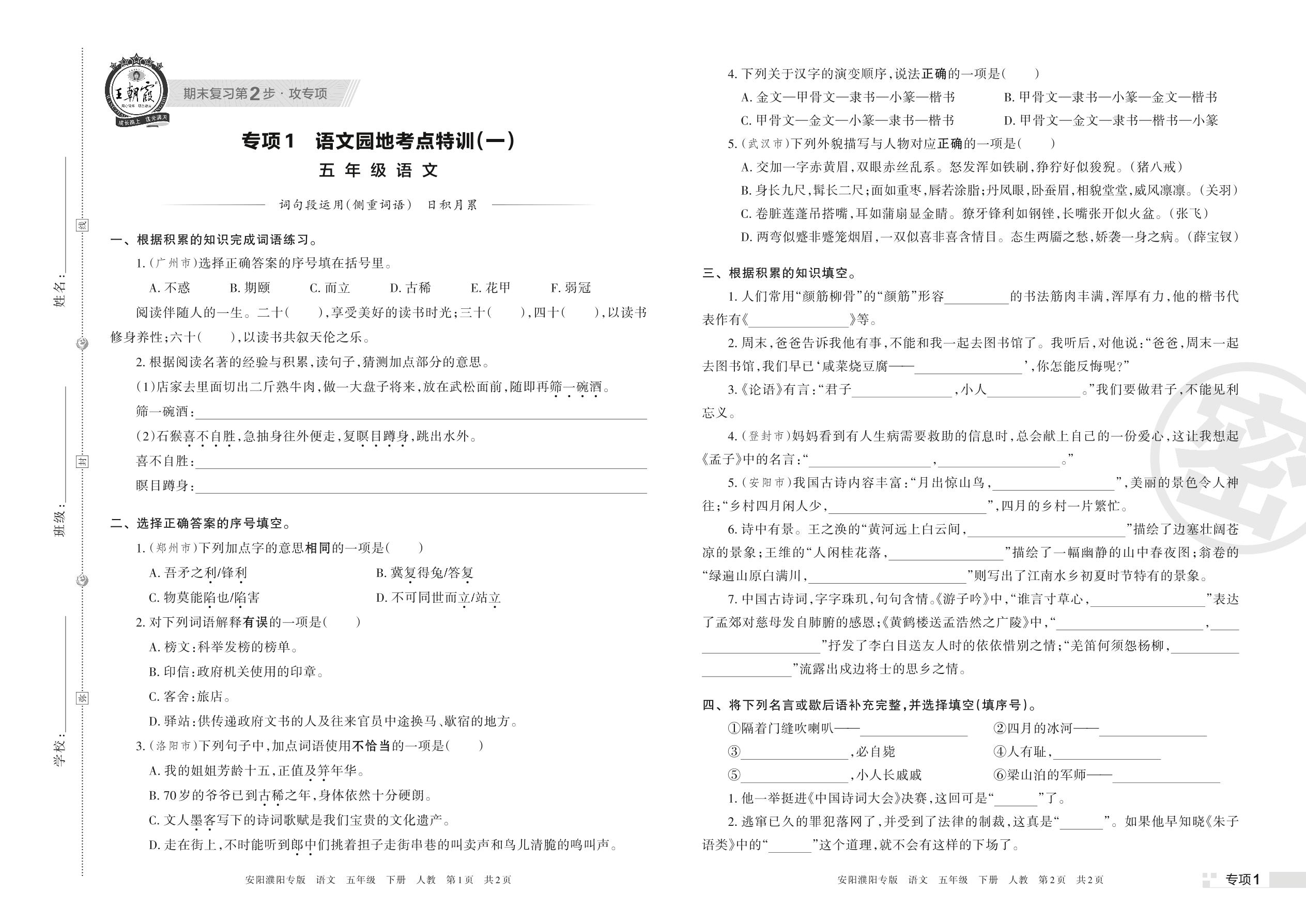 王朝霞期末专项卷——语文园地考点特训(一)五年级下册语文(人教版)_R220407112003039【1】
