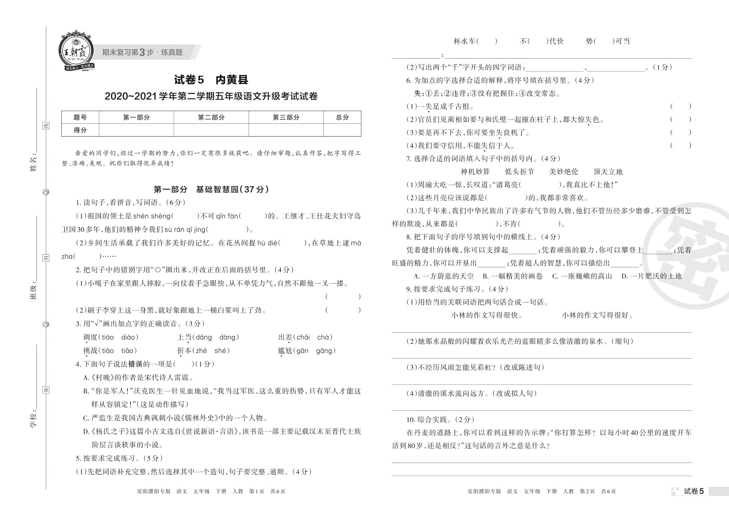 内黄县2020~2021学年第二学期五年级语文升级考试试卷(人教版)【5】