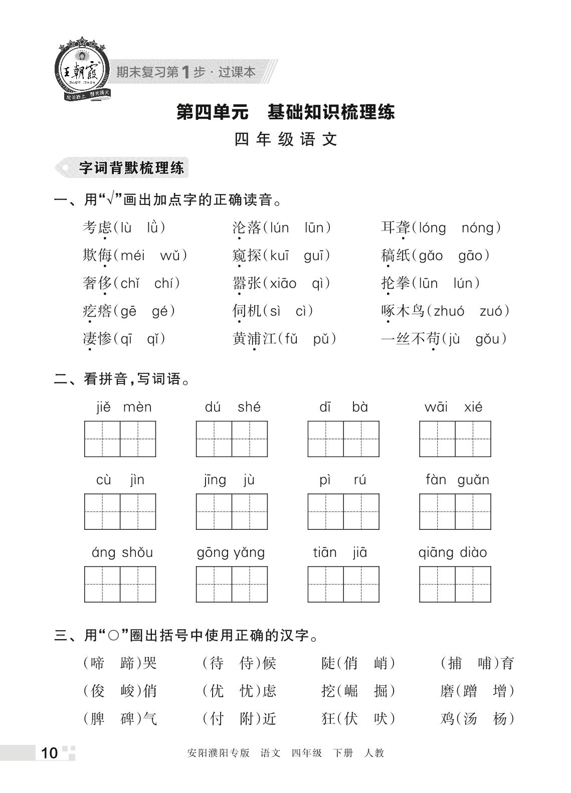 王朝霞期末过课本——第四单元 基础知识梳理练四年级下册语文(人教版)_R220407112552534