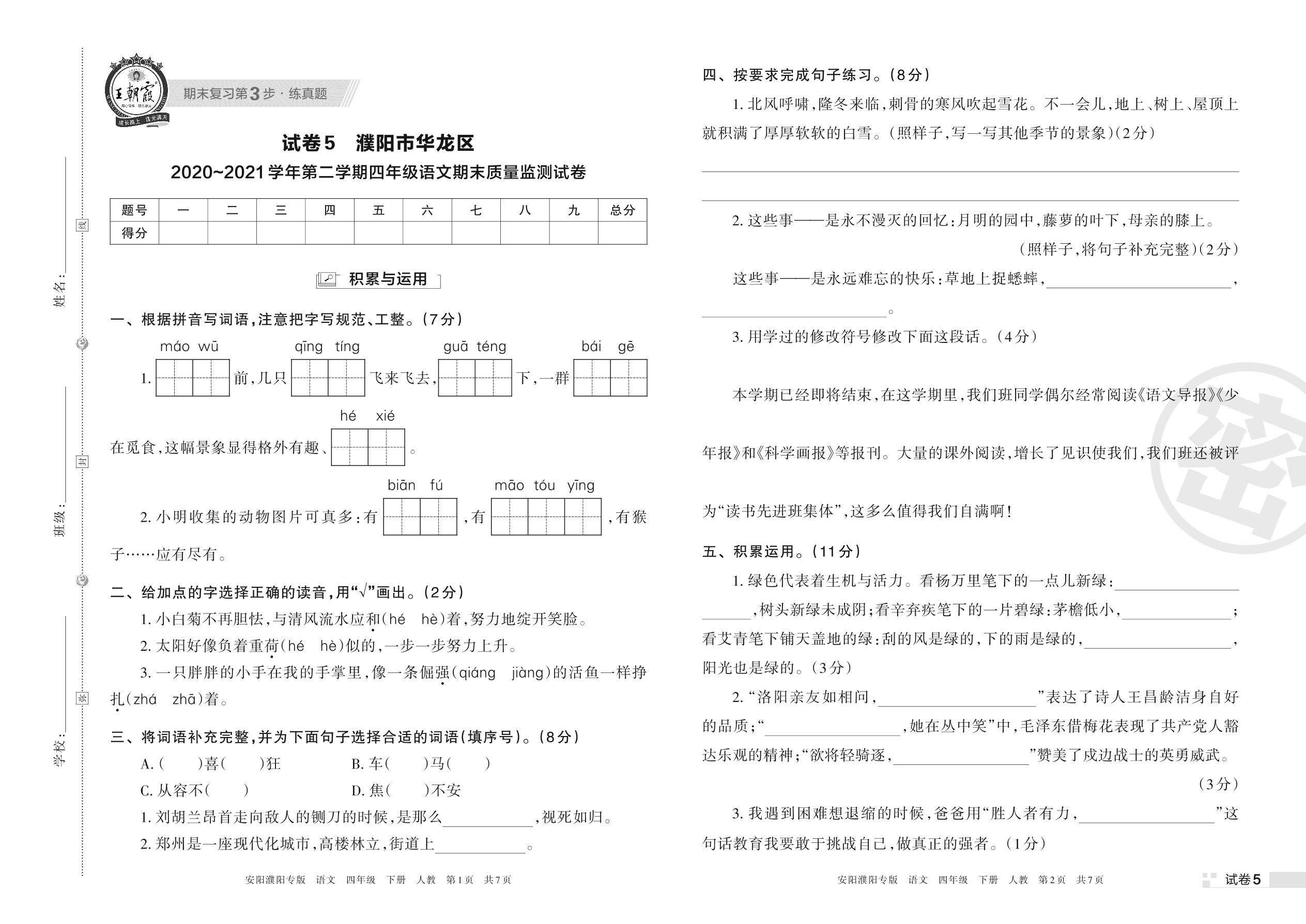 濮阳市华龙区2020~2021学年第二学期四年级语文期末质量监测试卷(人教版)【5】