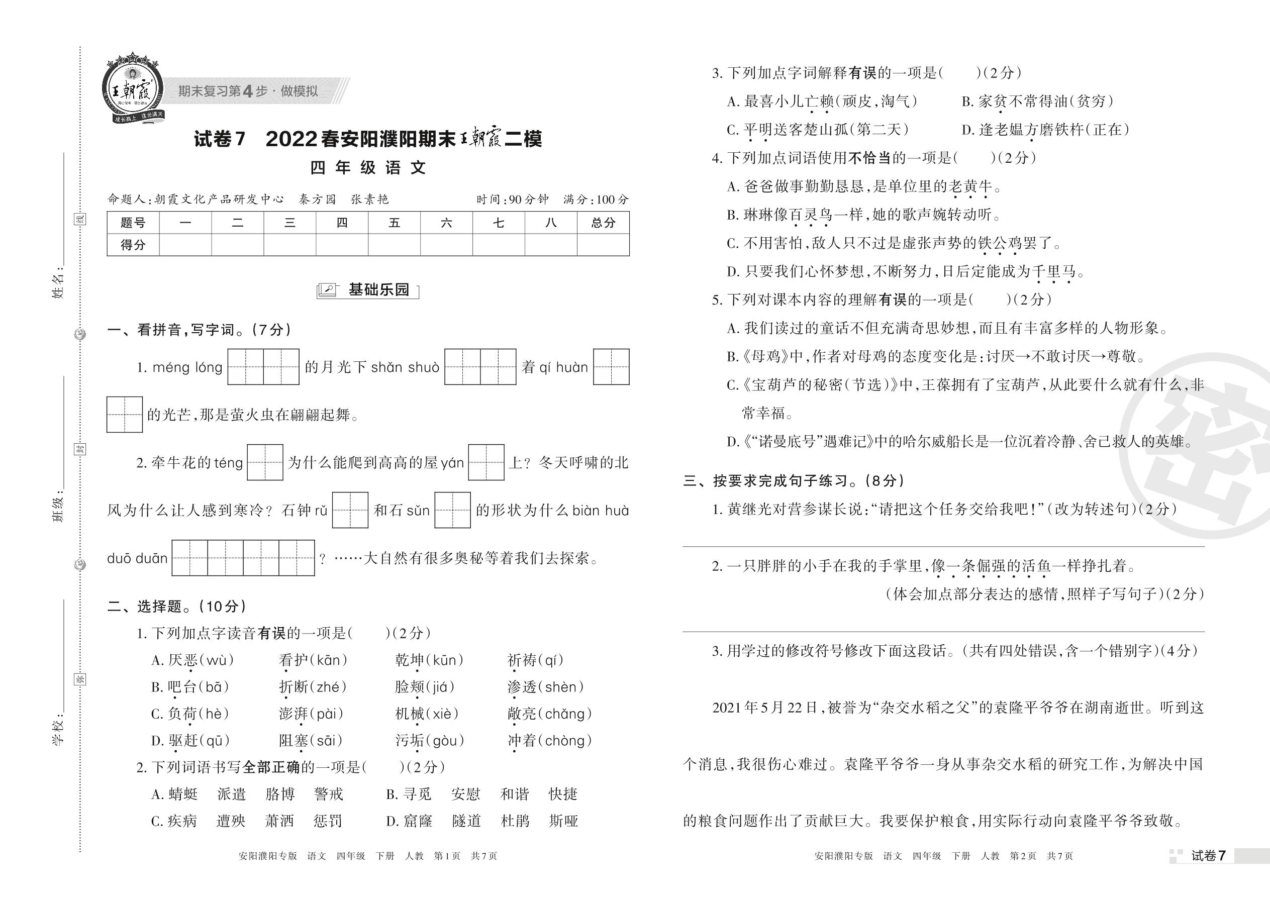 王朝霞期末模拟卷四年级下册语文(人教版)_R220407112553542【7】