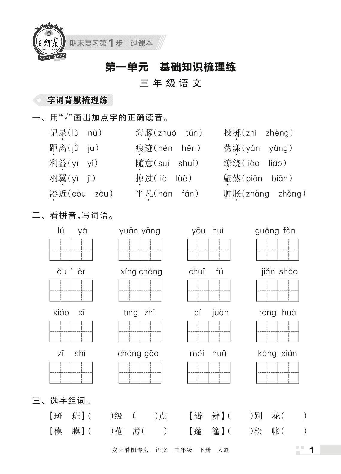 王朝霞期末过课本——第一单元 基础知识梳理练三年级下册语文(人教版)_R220407113345219