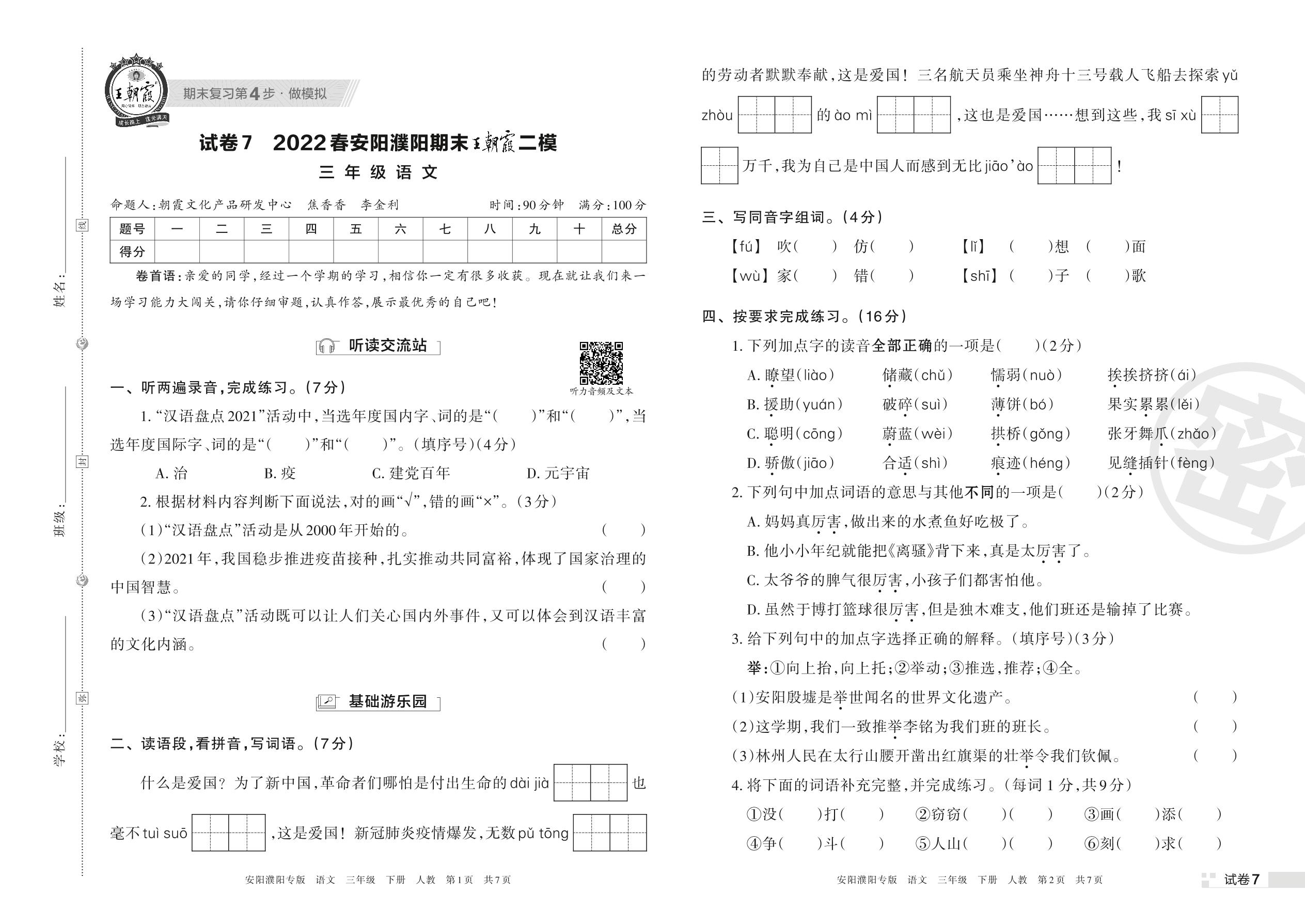 王朝霞期末模拟卷三年级下册语文(人教版)_R220407113347966【7】