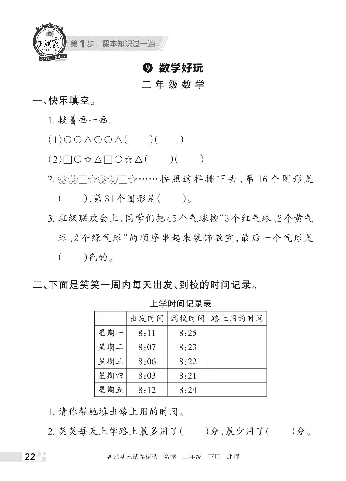 王朝霞期末过课本——9 数学好玩二年级下册数学(北师版)