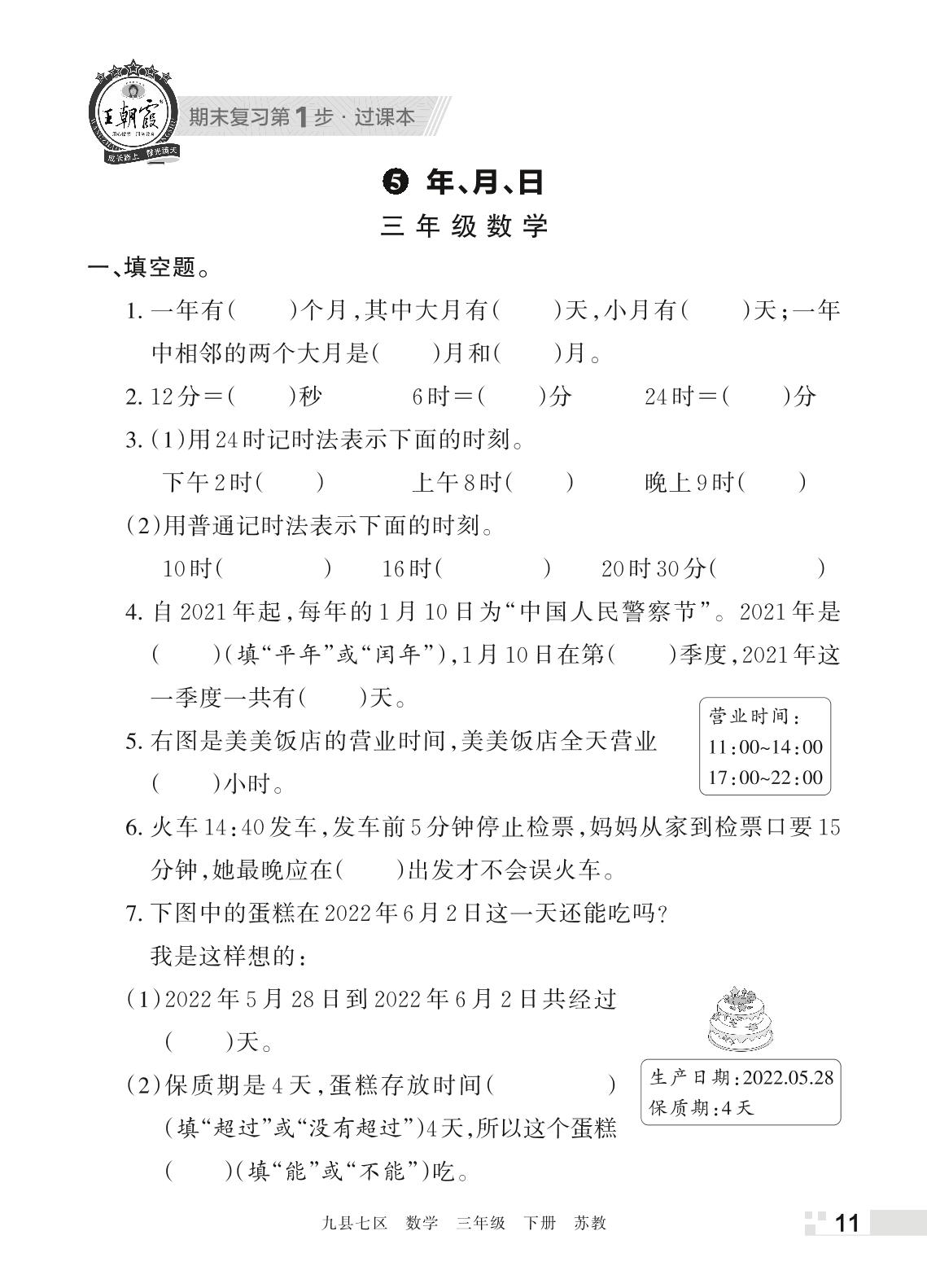 王朝霞期末过课本——5 年、月、日三年级下册数学(苏教版)_R220407153500462